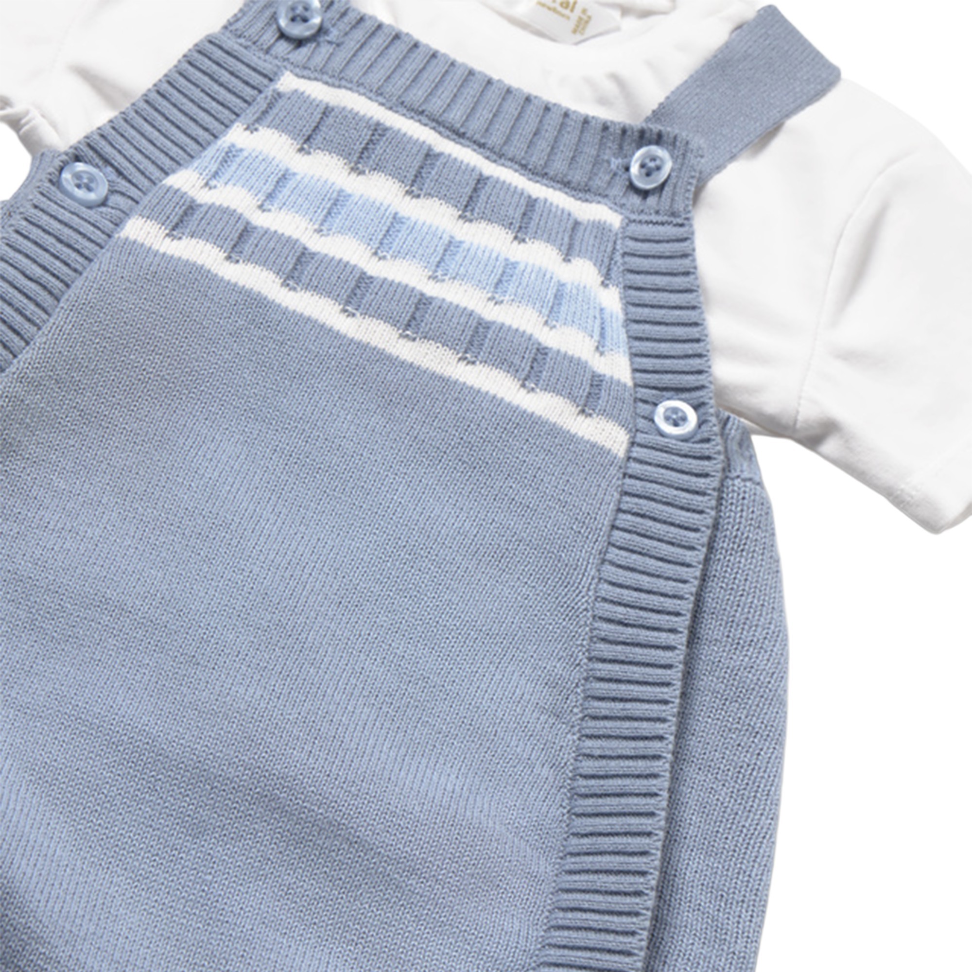 T-shirt bianca, salopette tricot azzurra con dettagli a righe,