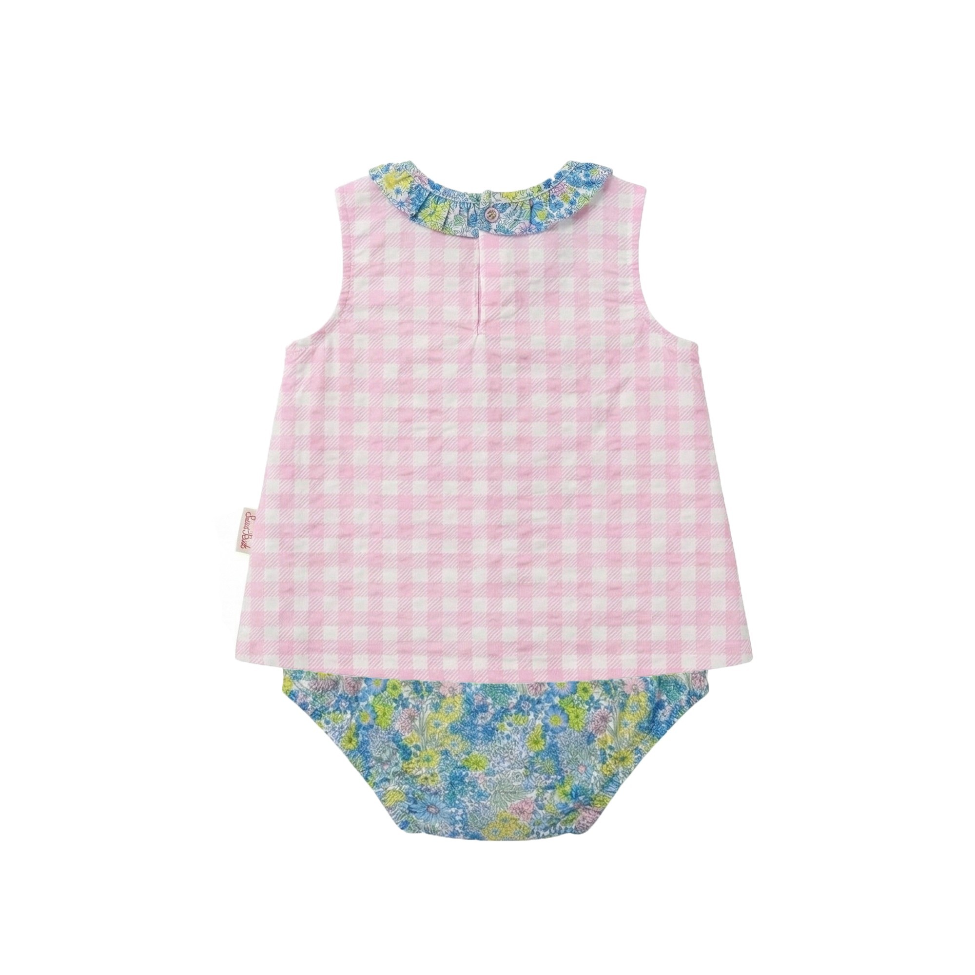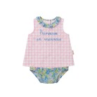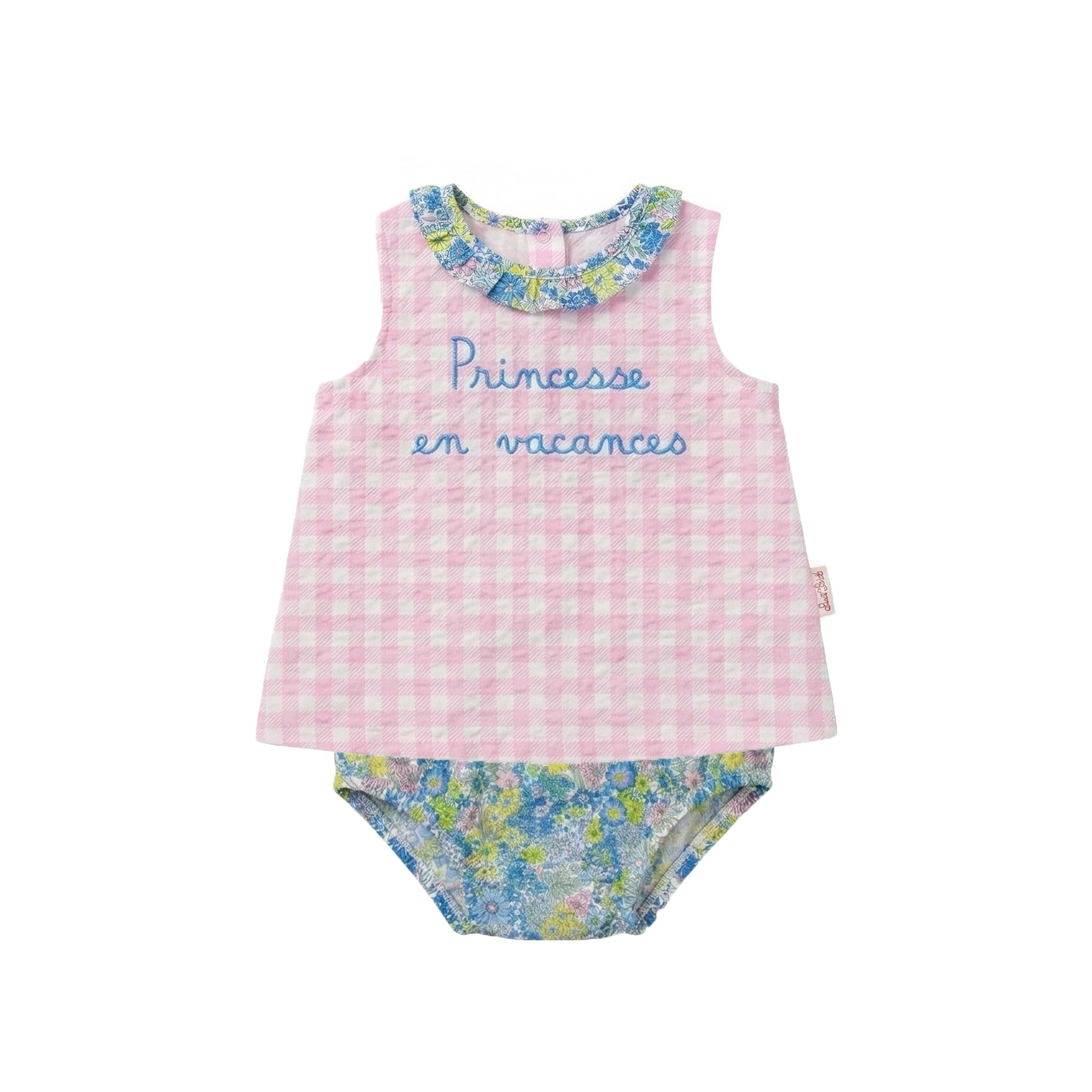 scritta azzurra " Princesse en vacances" frontale, bottoncini automatici sul retro e culottes copripanno floreale multicolor.