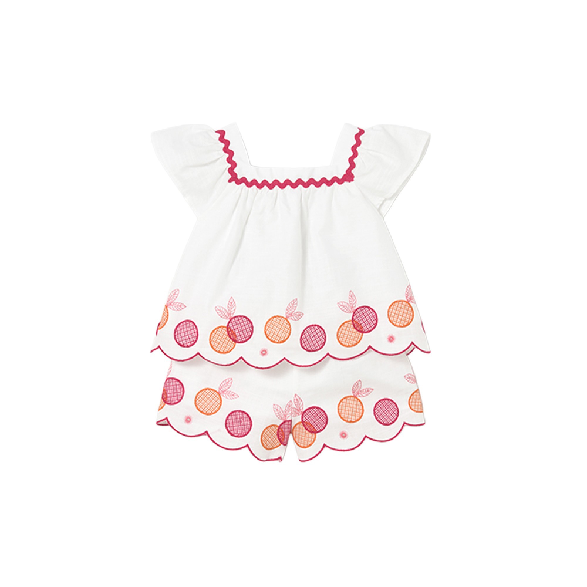 Composto da t-shirt bianca con ricami arancioni e fucsia,