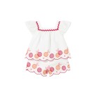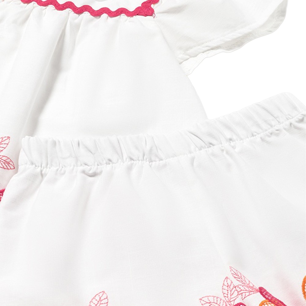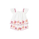 Shorts bianchi con orlo smerlato fucsia e ricami frutta.