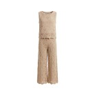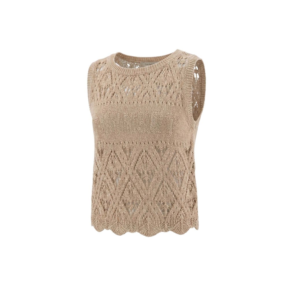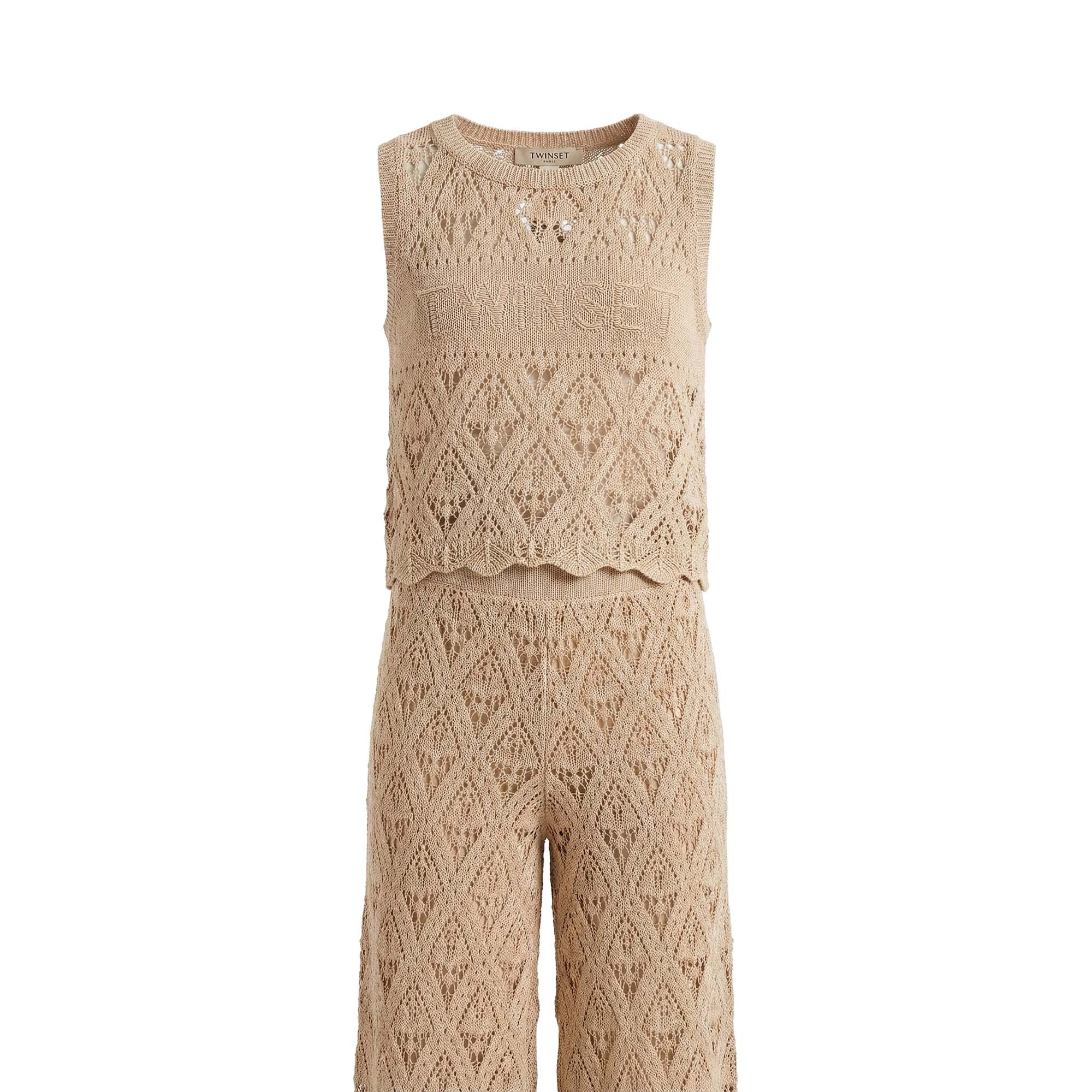 Top smanicato beige macramè con logo intarsiato,
