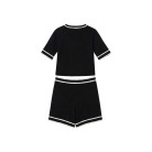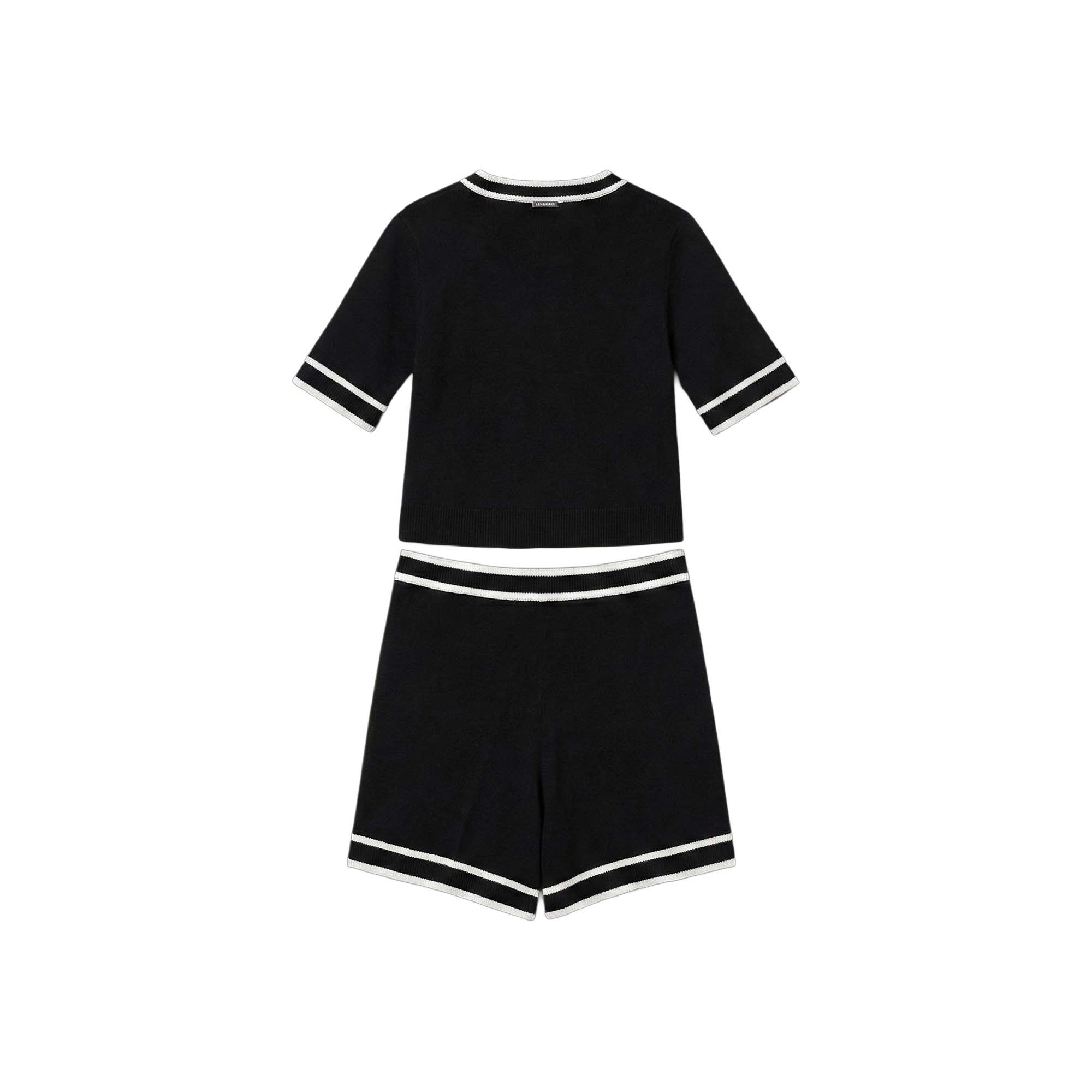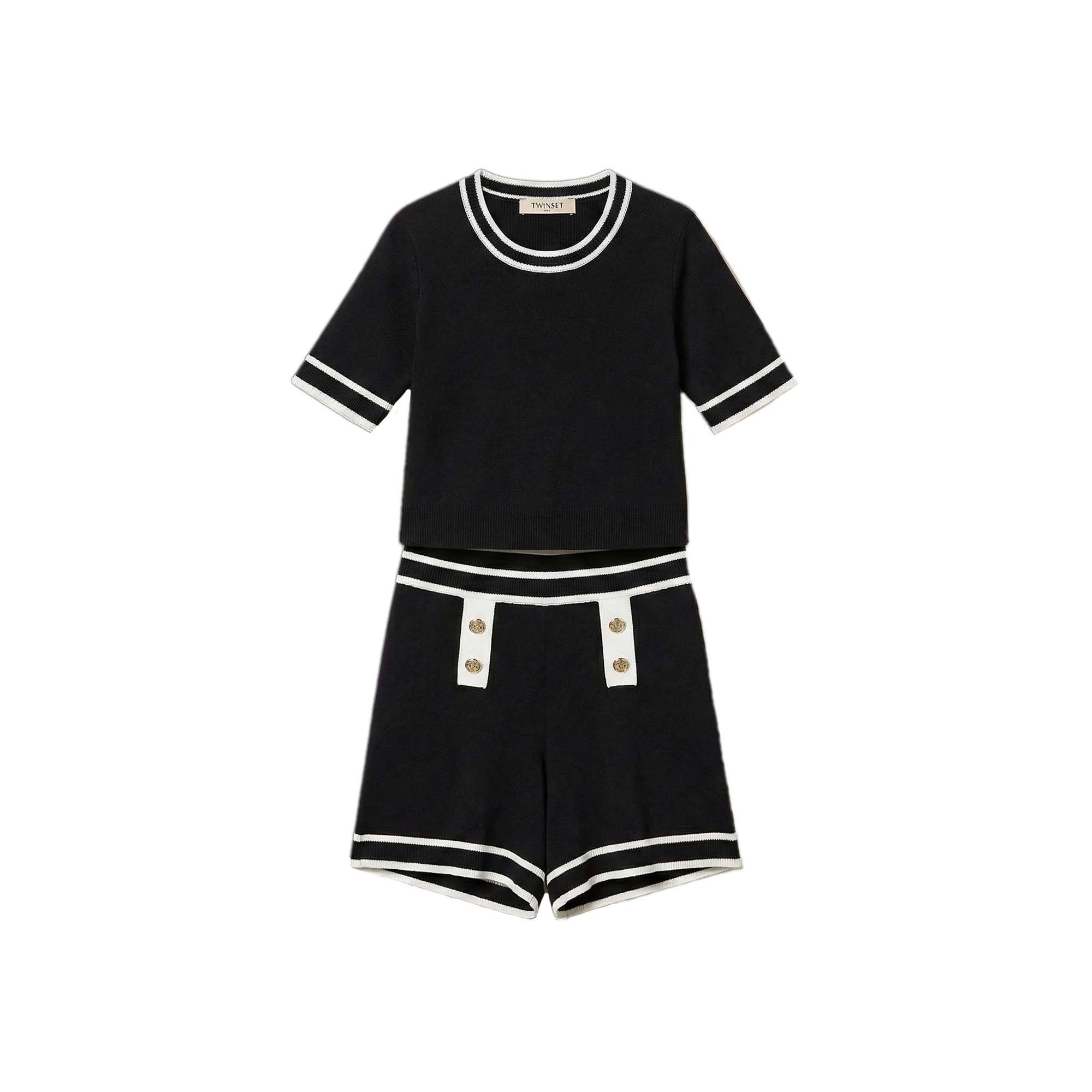 Maglia bianca con profili neri, orli a costine, shorts bianchi