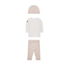 Completo beige composto da t-shirt a maniche lunghe, pantalone e cappellino in cotone.