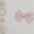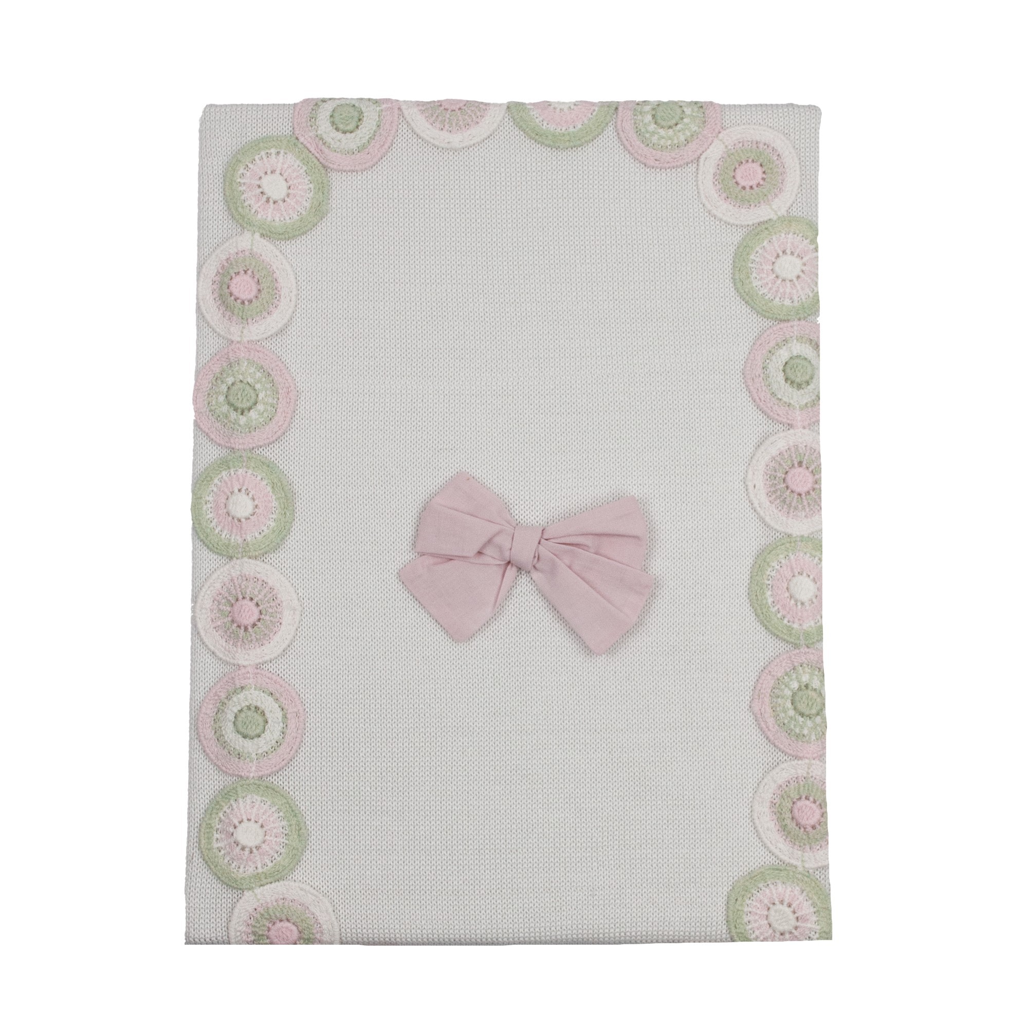 Coperta per carrozzina in cotone 100% extrafine lavorazione artigianale in italia maglia traforata con dettaglio fiocco e applicazioni multicolor