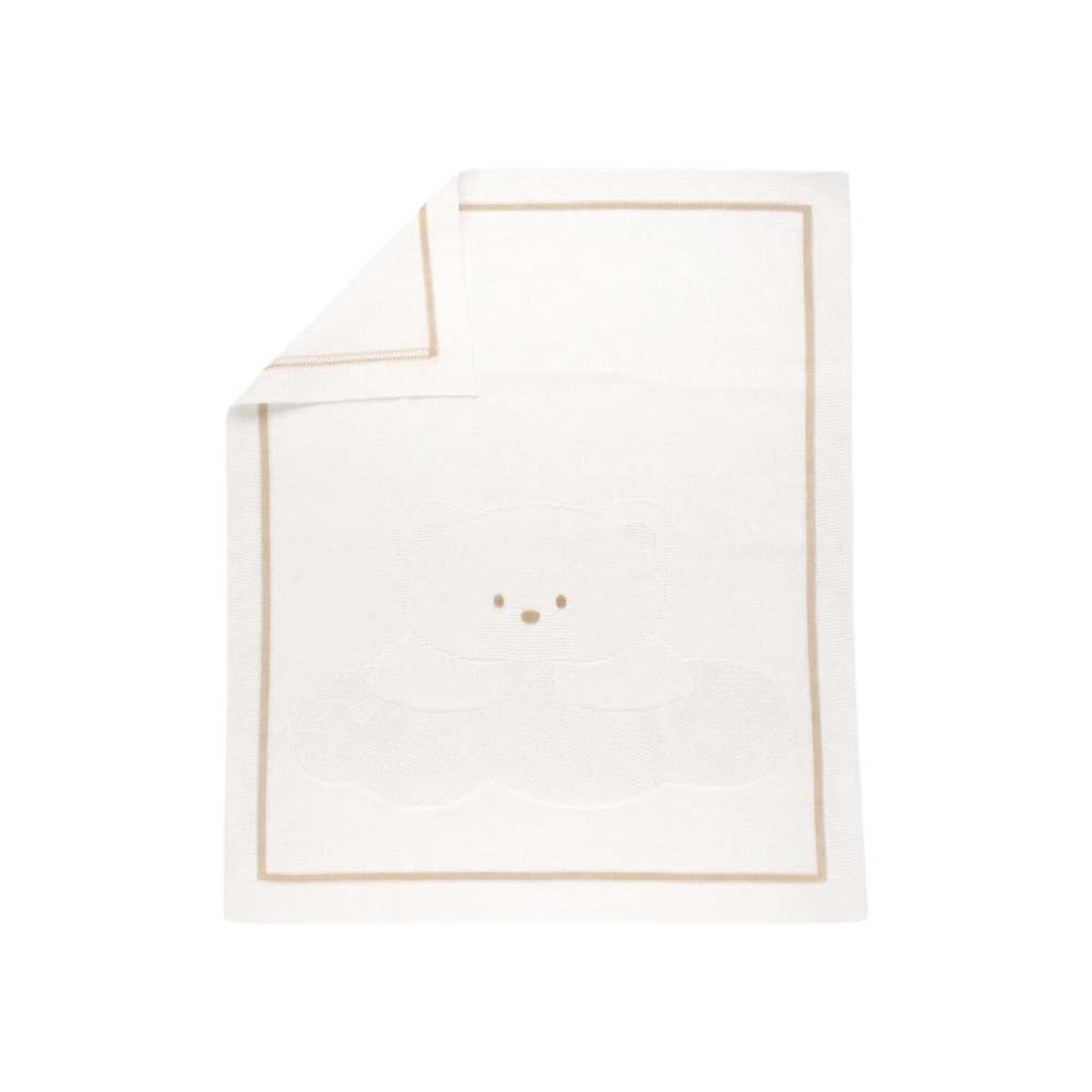 fondo bianco, profili sabbia e ricamo a orsetto sabbia.