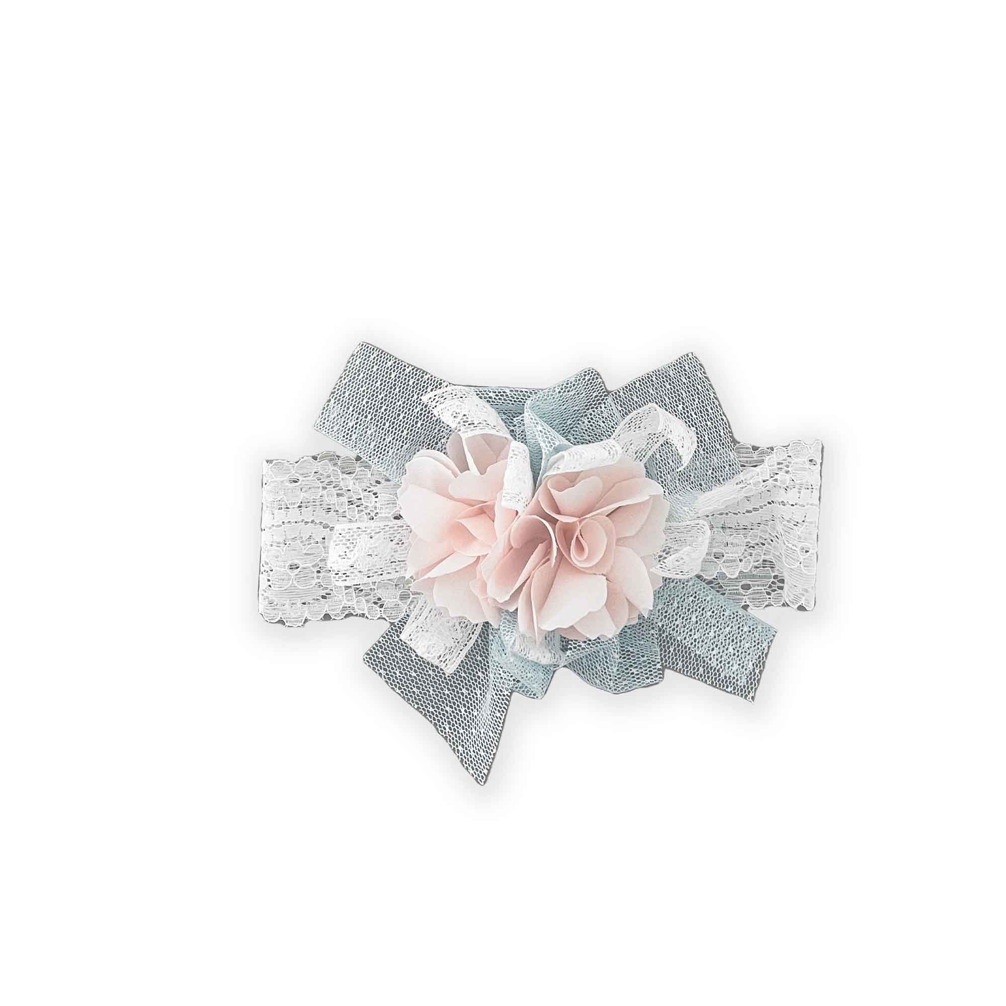 Applicazione frontale con fiocco azzurro e fiore rosa