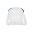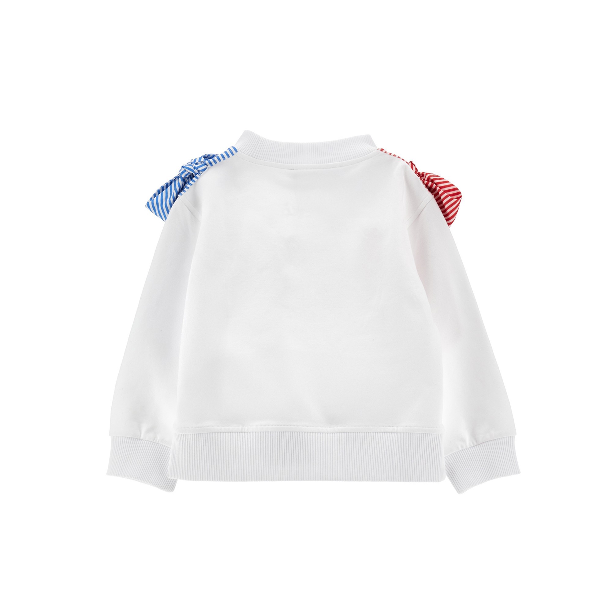 fiocchi a righe rosso e azzurro sulle spalle e orli a costine.