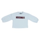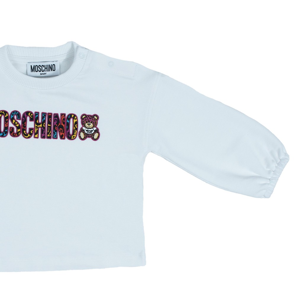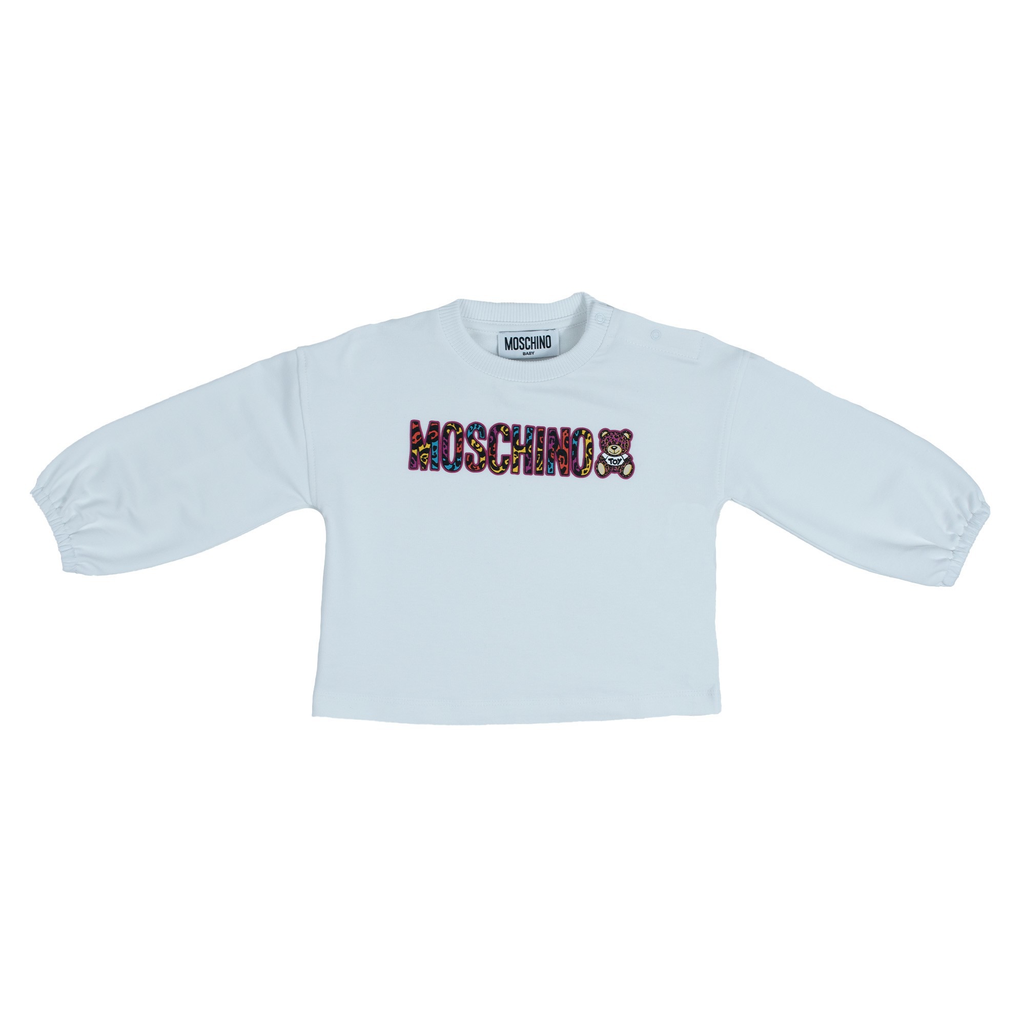 Felpa per neonata di colore bianco di Moschino Kids in cotone 100% con manica lunga modello girocollo con apertura laterale tramite 2 bottoni bottoccini a pressione stampa gommata e logo frontale,tessuto a costine elasticizzate sul collo sui polsini arricciatura elastica