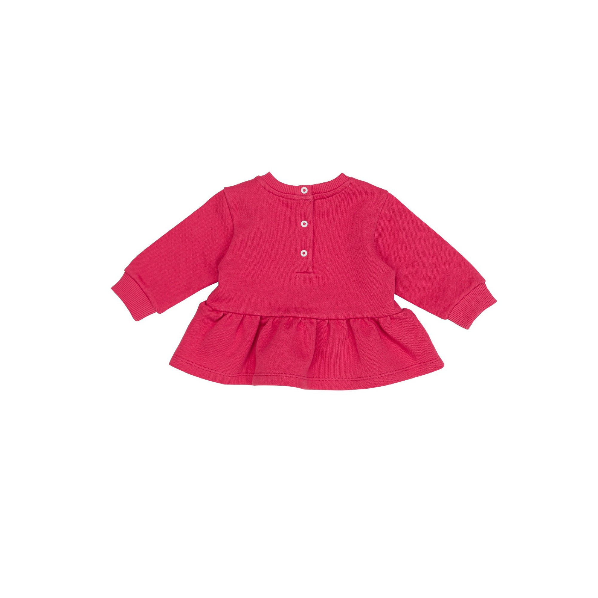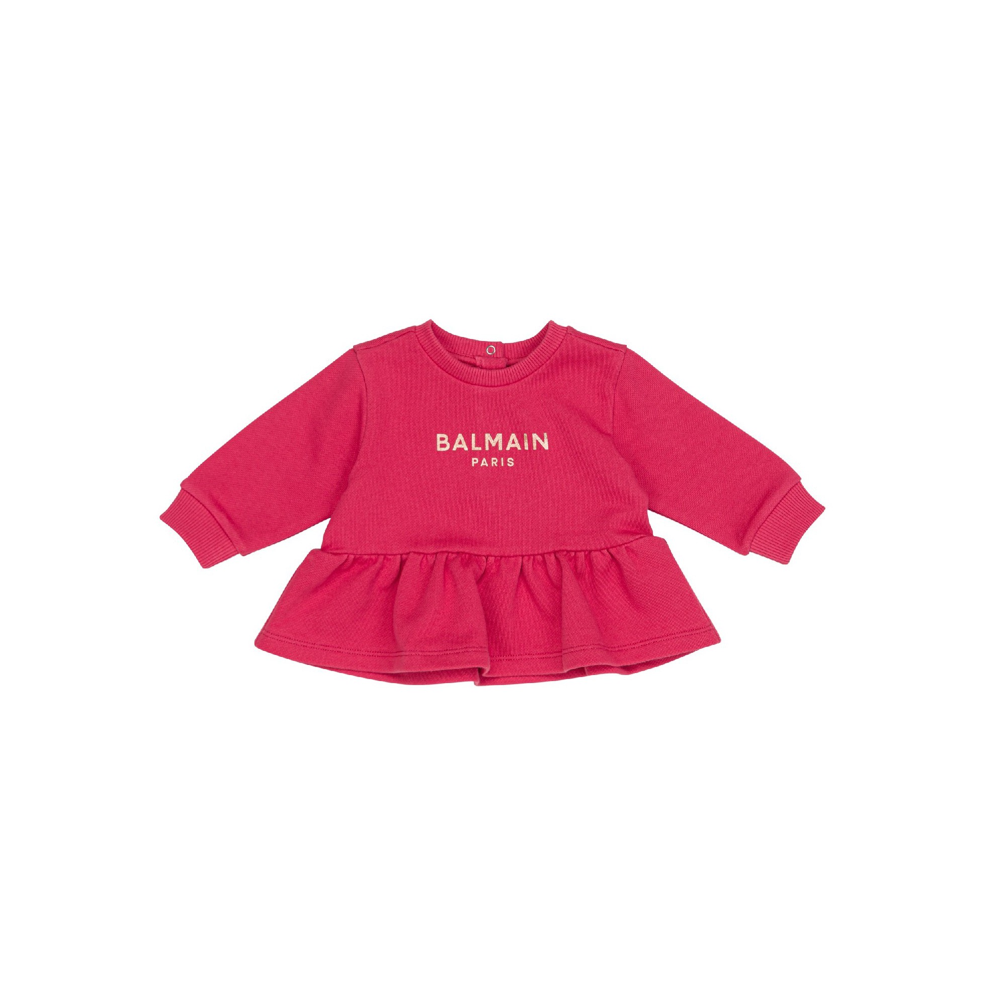 Felpa rosa corallo con balza sotto logo Balmain Paris oro avanti polsini elasticizzati sulle maniche apertura comoda dietro con bottoni a pressione