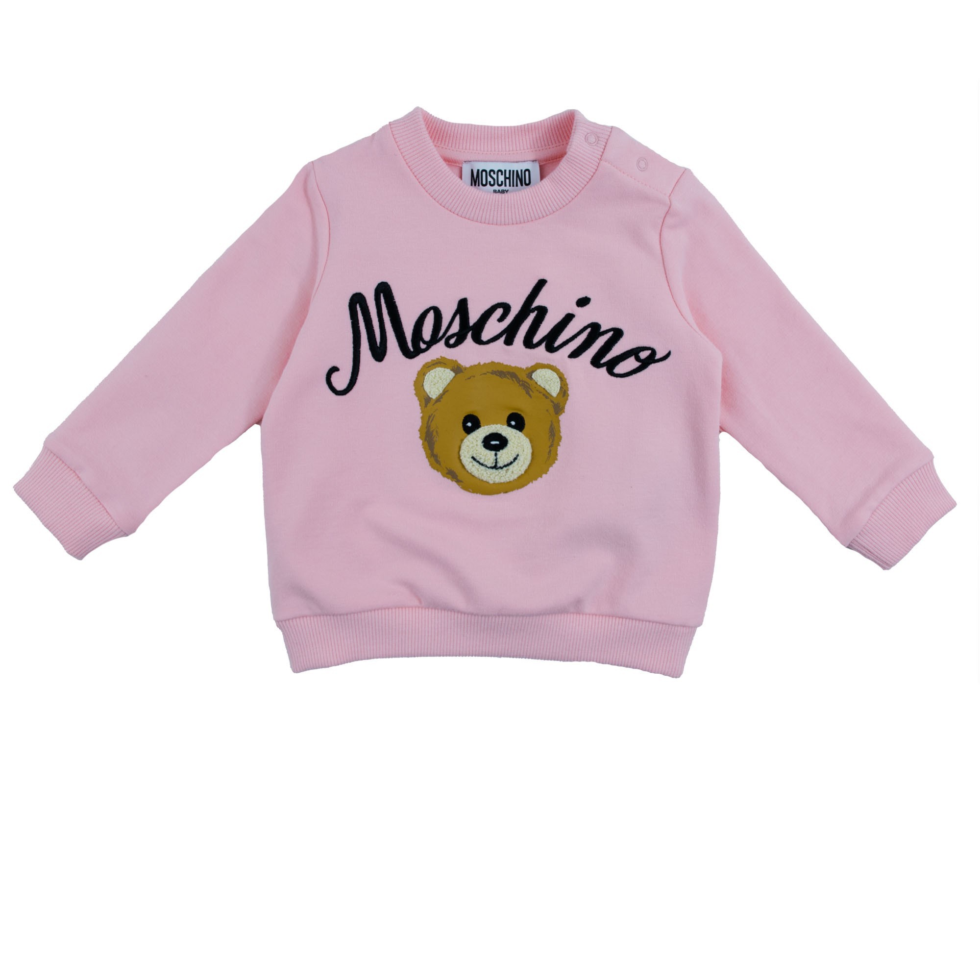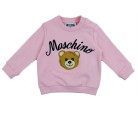 Felpa paricollo felpa rosa con polsino sulle maniche e in vita apertura sul collo con bottoncini logo moschino ricamato nero applicazione orso in rilievo