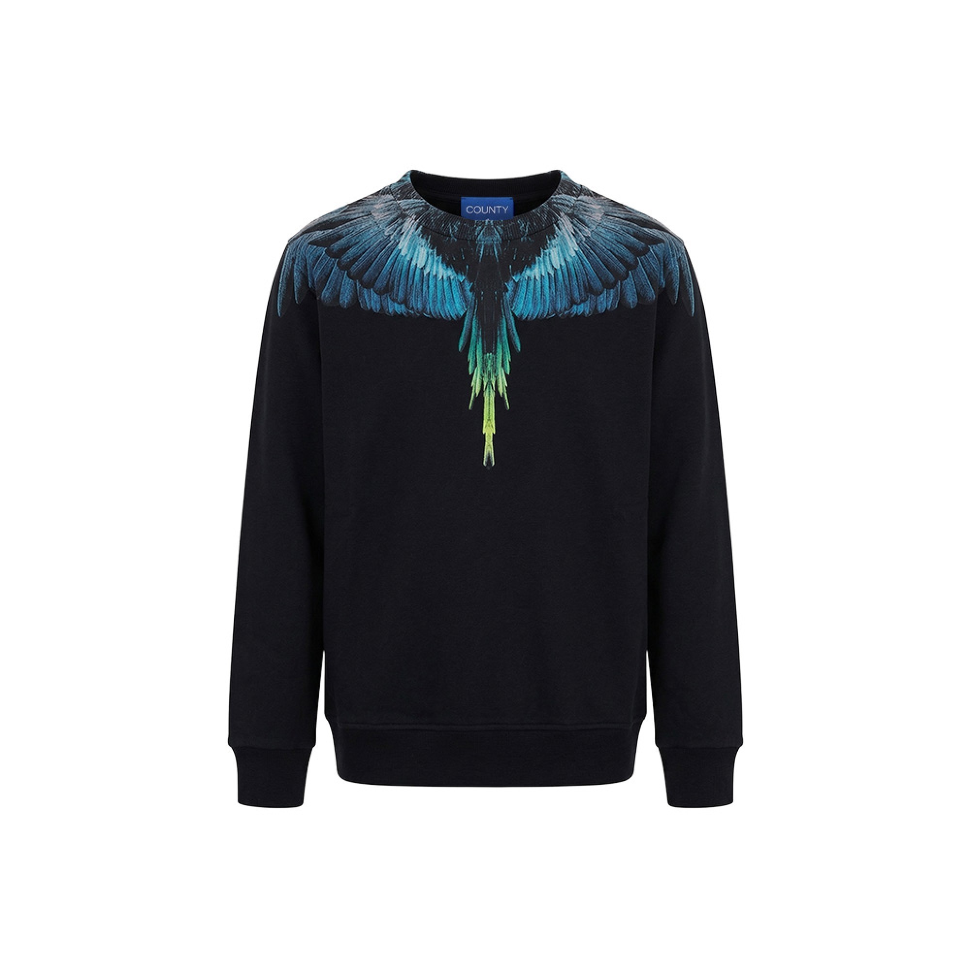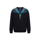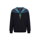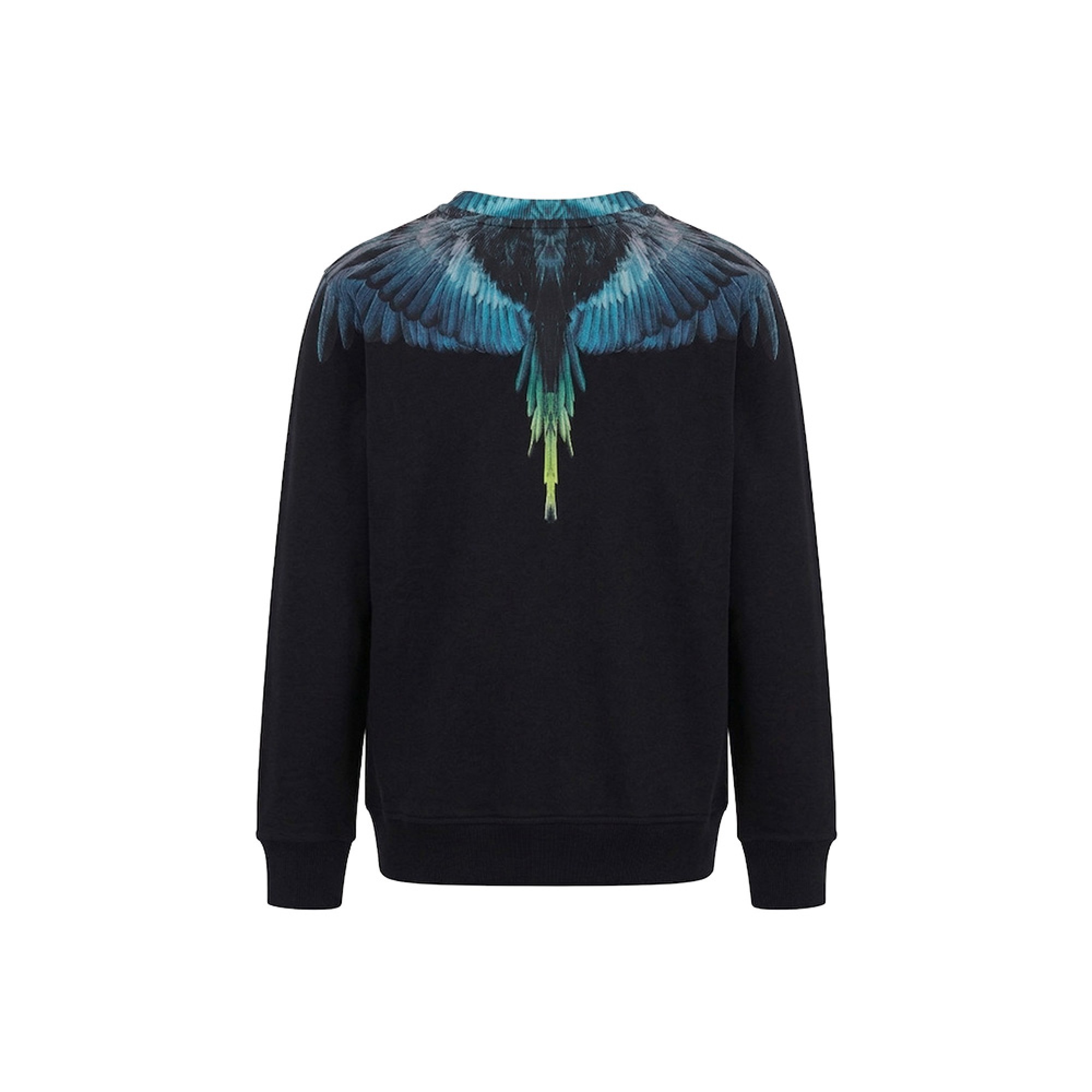 In cotone garzato, girocollo, stampa ali multicolor,