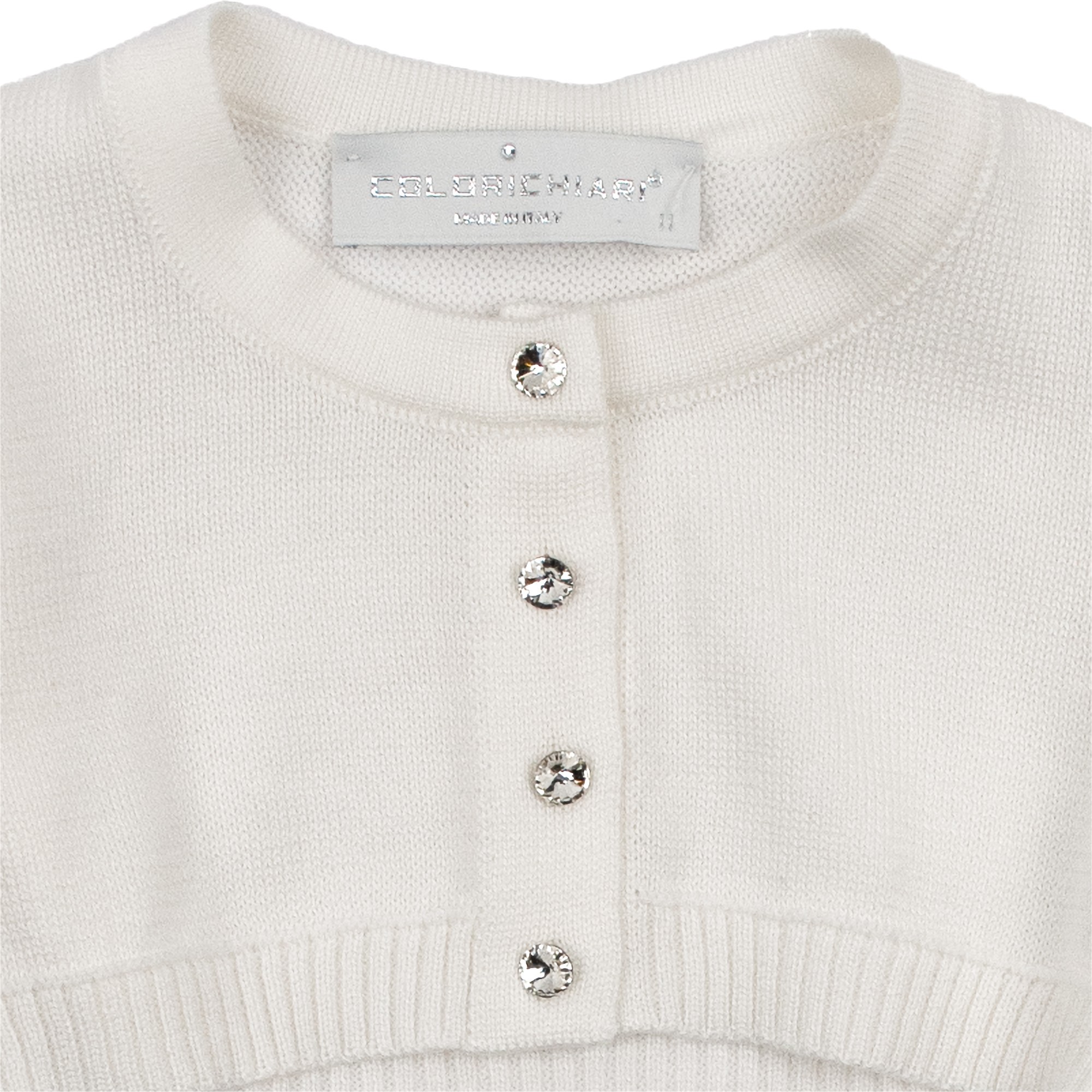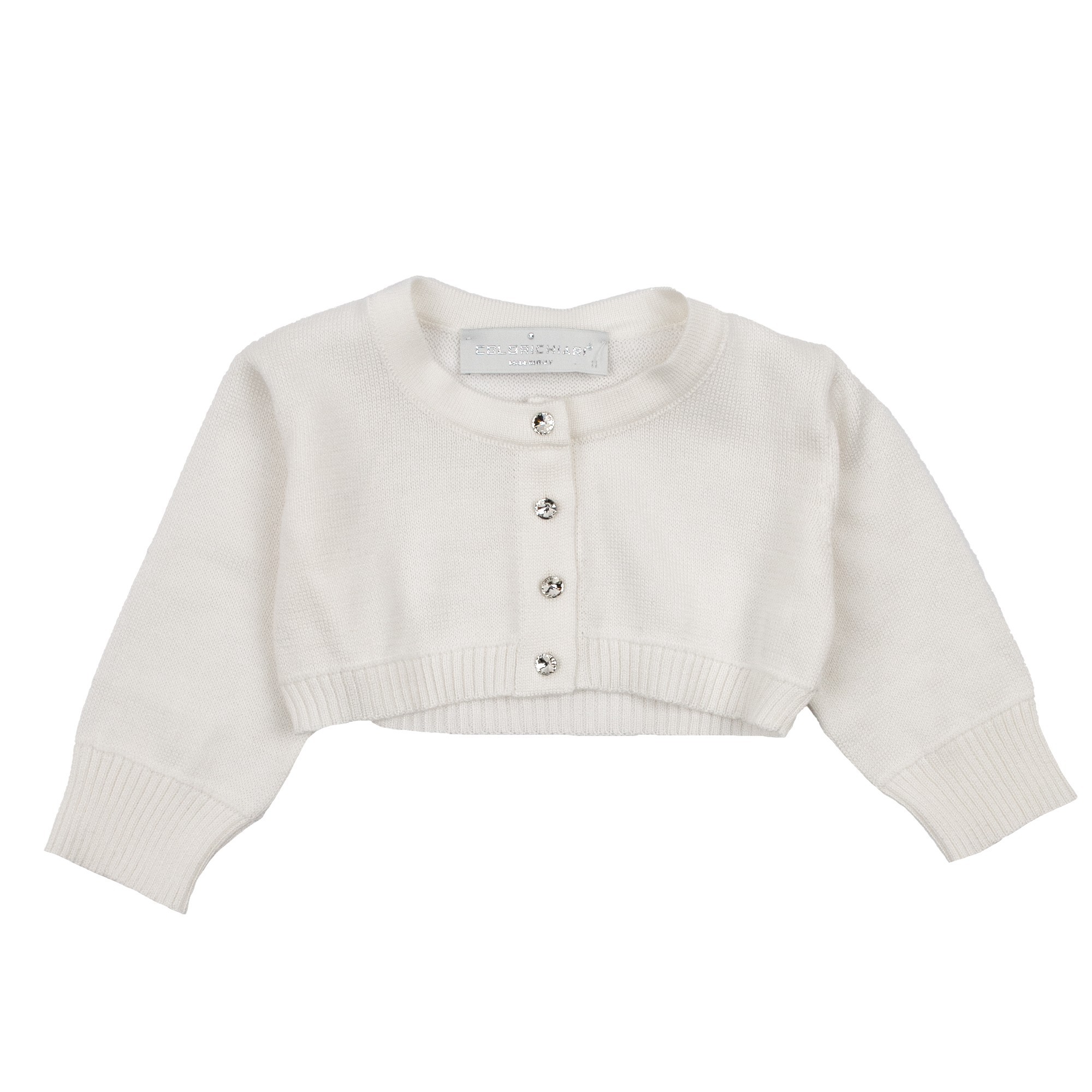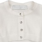 Giacca corta in filato di cotone manica lunga, girocollo, polsini e vita in tessuto a costine elasticizzate apertura con bottoni gioiello color panna per neonata