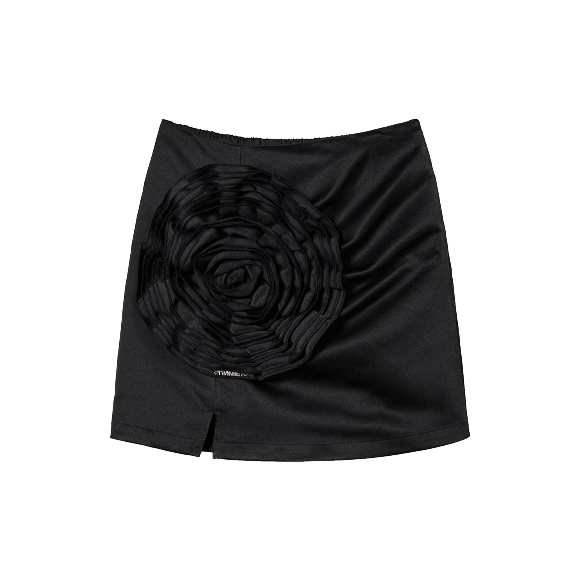 Gonna corta in duchesse con dettaglio di macro rosa e pieghe trattenute davanti, piccolo spacco al fondo, zip al fianco.