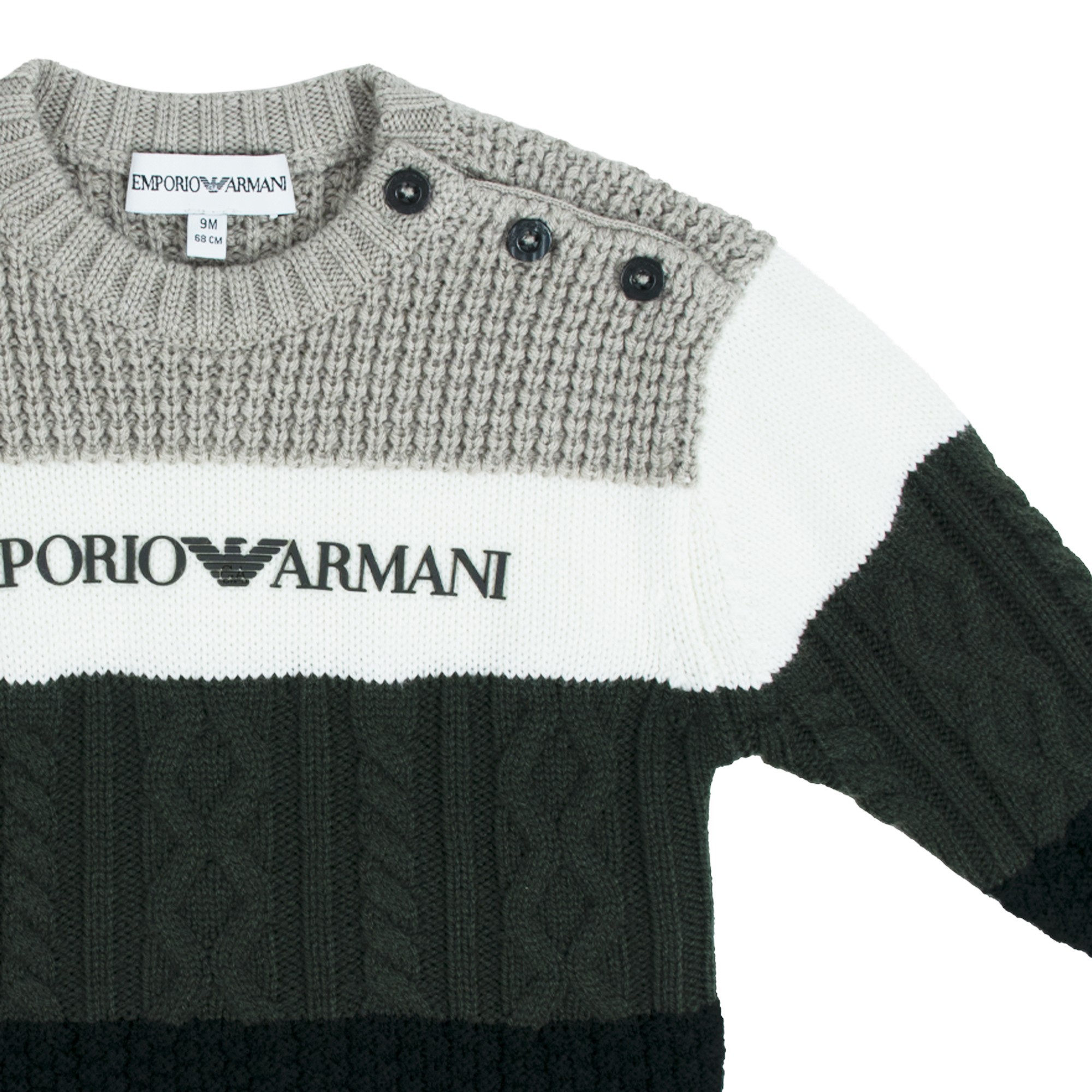 Maglioncino girocollo in mistolana rasata con 3 bottoni sulla spalla e il logo Emporio Armani stampato d'avanti il maglioncino è a fascioni con filato tramato in differenti lavorazioni di colori beige panna verdone e nero