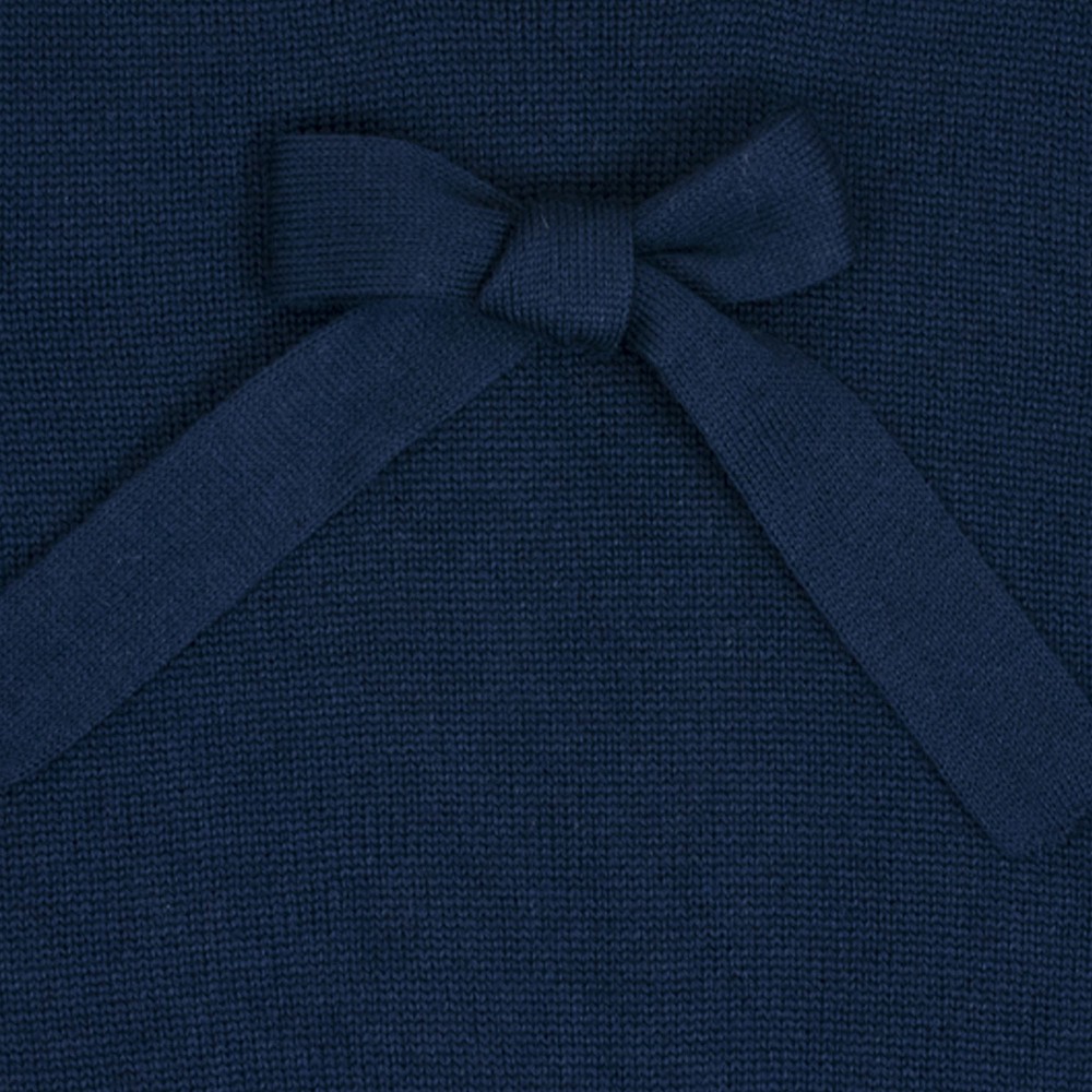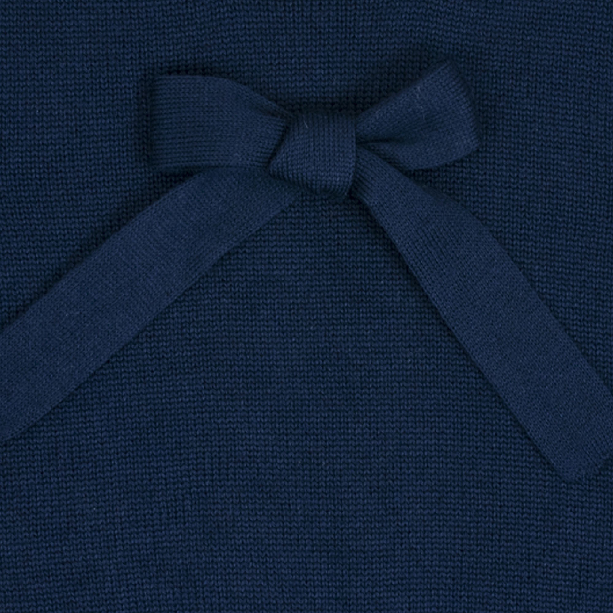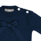 Maglia in filato in pura lana vergine manica lunga apertura con bottoni laterali girocollo elastico fiocco applicato avanti maglia a costine sui polsini e in vita.