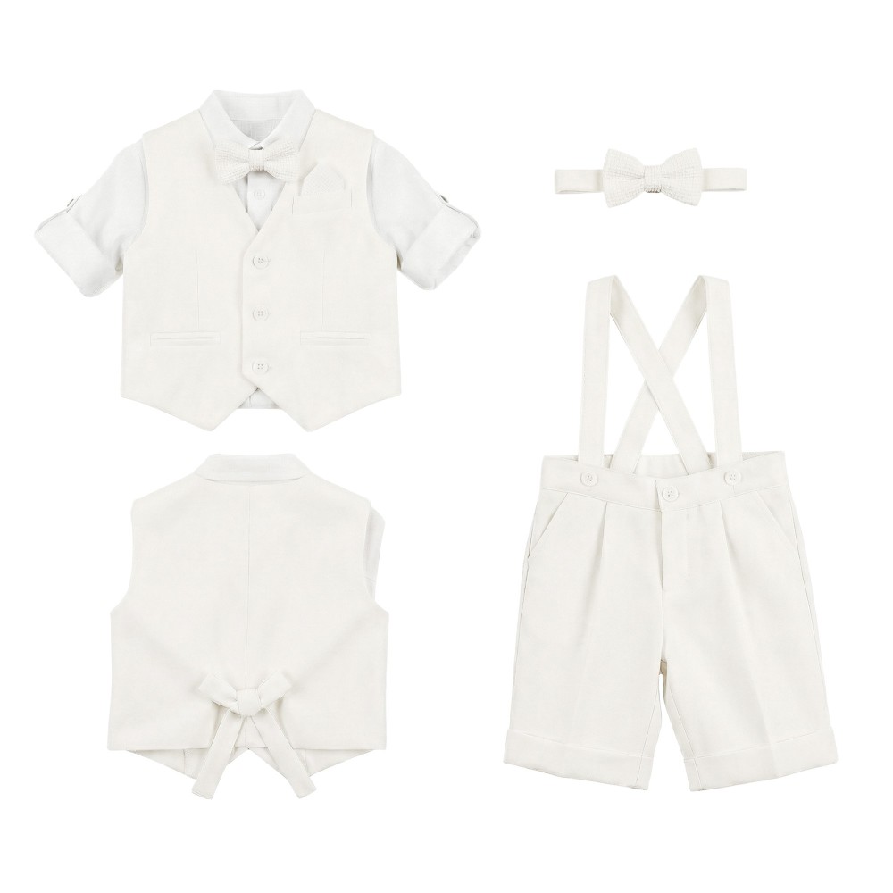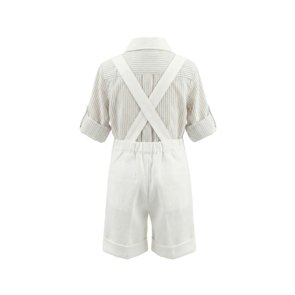 Pantaloni bianchi con bretelle e bottoni, gilet bianco con bottoni,