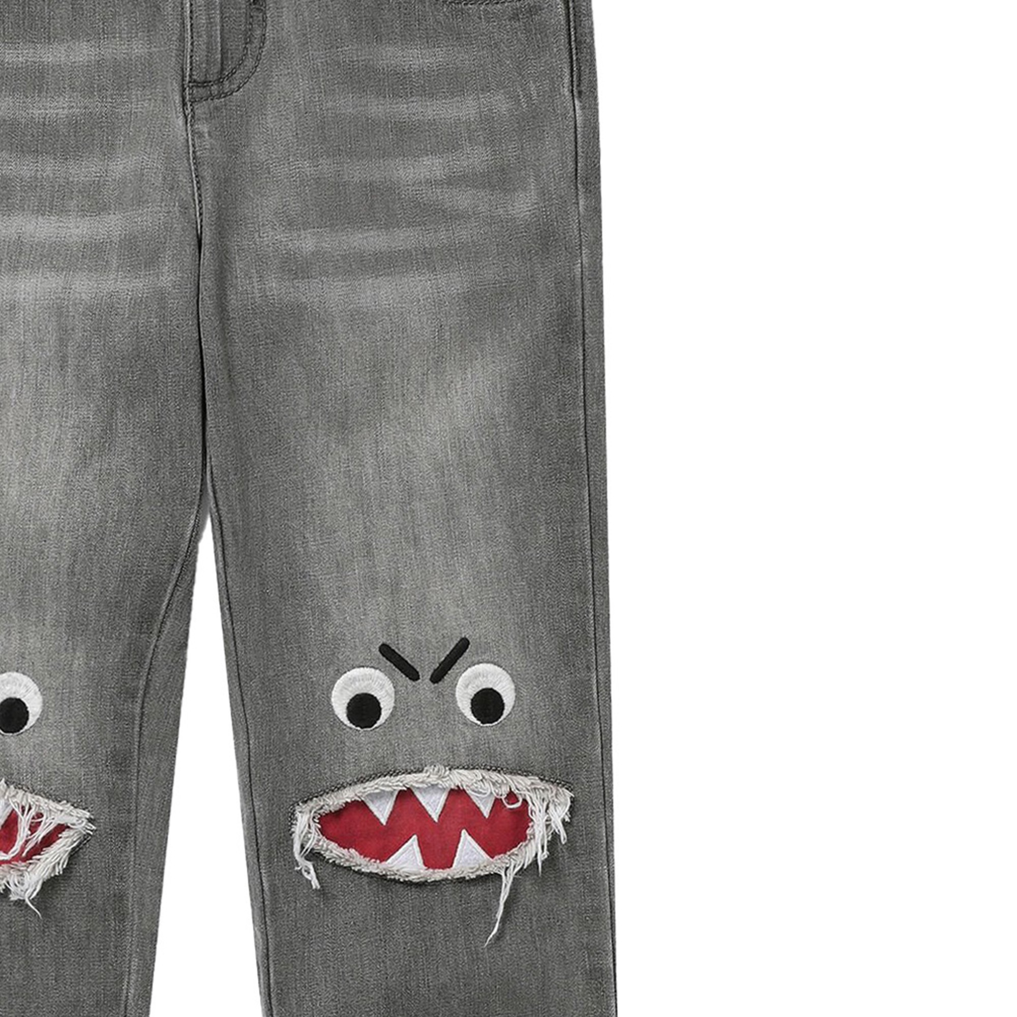 Colore: Grigio Grigio lavaggio medio Denim di cotone biologico Cerotti sul ginocchio strappati dal muso e dai denti di squalo
