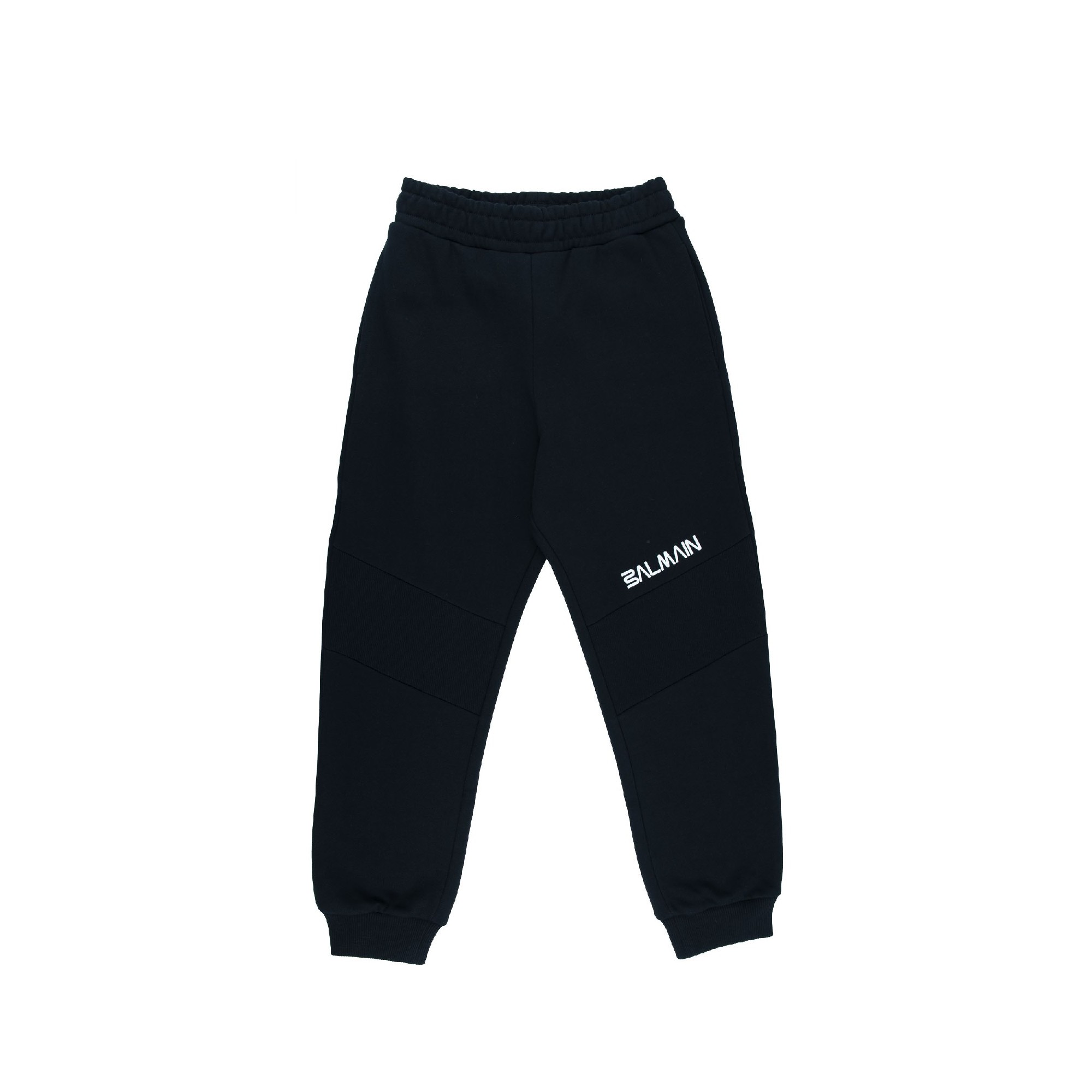Pantalone in felpa con logo bianco Balmain su gamba dx con dettaglio obliquo in tessuto elasticizzato su ginocchio e polsini lato posteriore con applicazione tasca