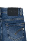 Jeans tessuto elasticizzato blu denim, modello cinque tasche gamba stretta passanti in vita,chiusura frontale con zip e bottone, vestibilita in vita regolabile grazie ad elastici interni con bottone, impunture a contasto etichetta logo sul retro.