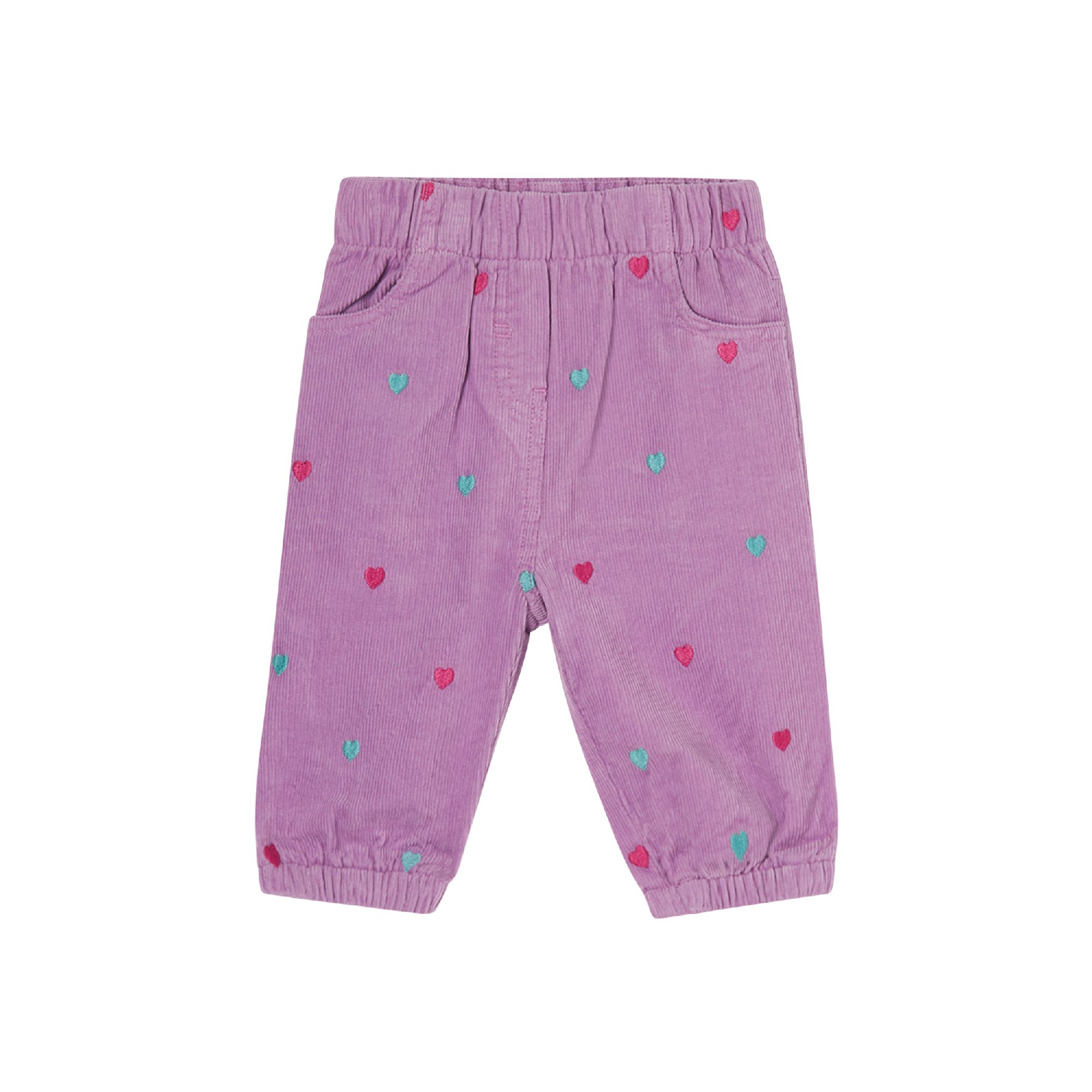 Pantalone in velluto tutto elastico in vita e sulle caviglie ricamo di cuoricini verde e fucsia con due tasche sia dietro che avanti