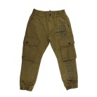 Pantalone modello cargo con elastico in vita e in fondo sulle gambe taschoni chiusura bottoni e stampa Dsquared2 su gamba sx avanti