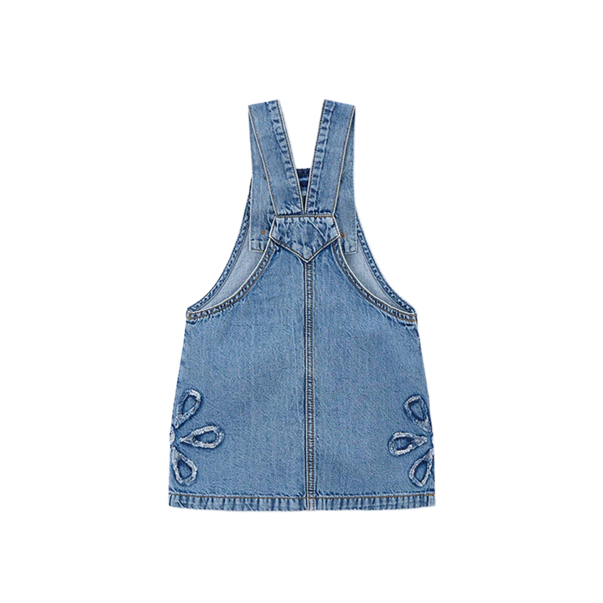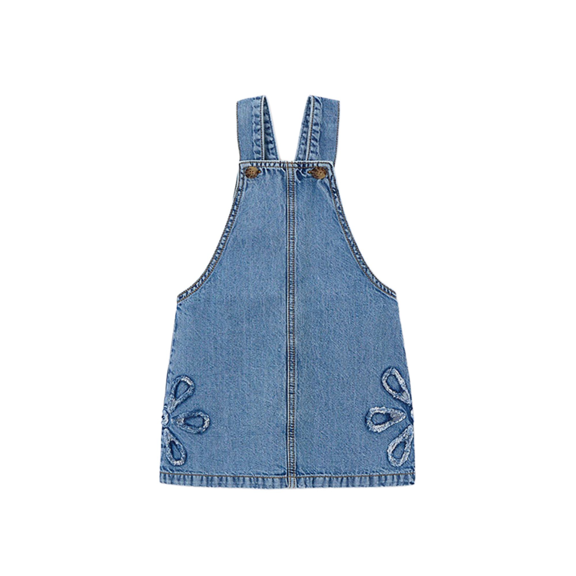 bretelle con bottoni, due fiori in rilievo ai lati.