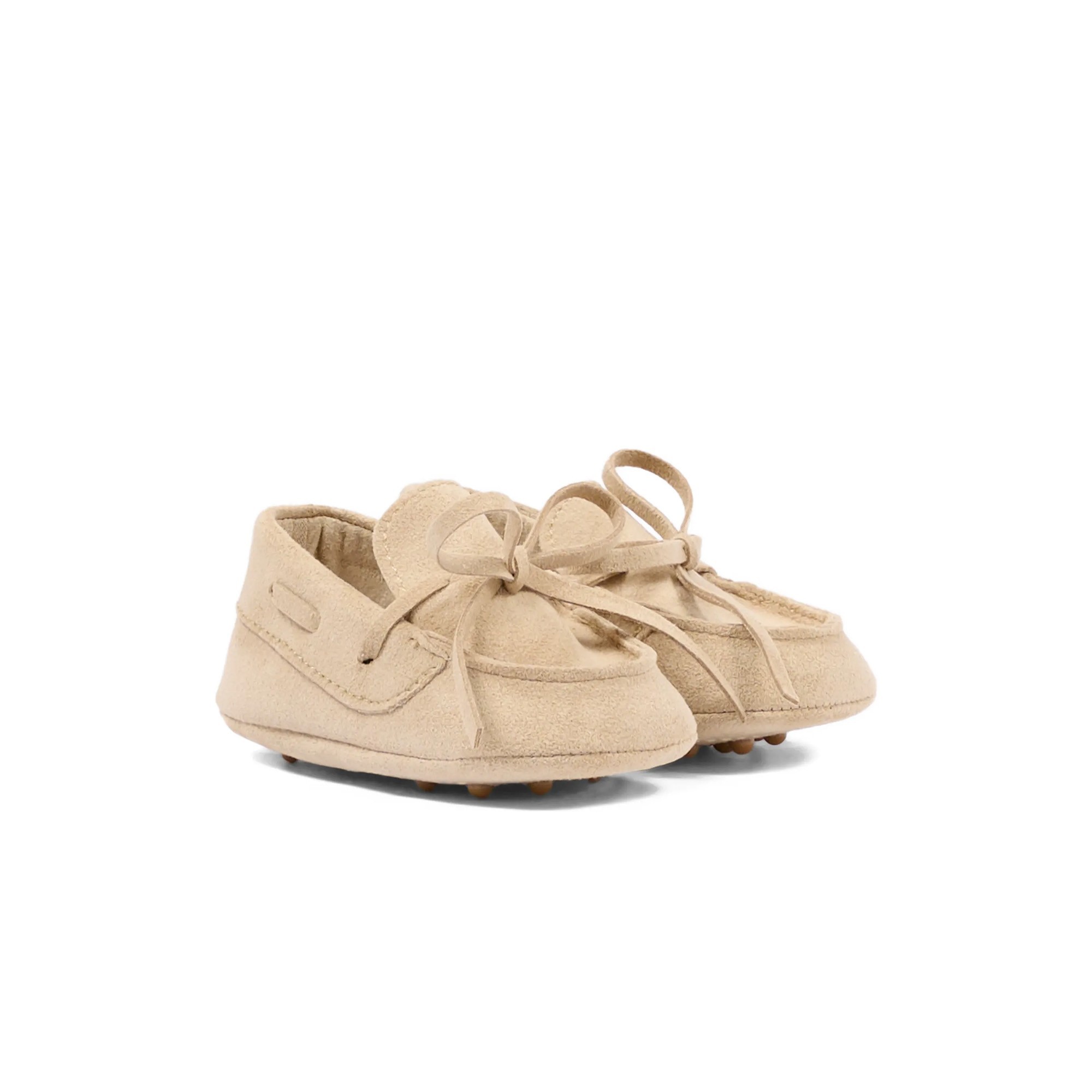 In alcantara sabbia, scarpa da culla, fiocchetti frontali,
