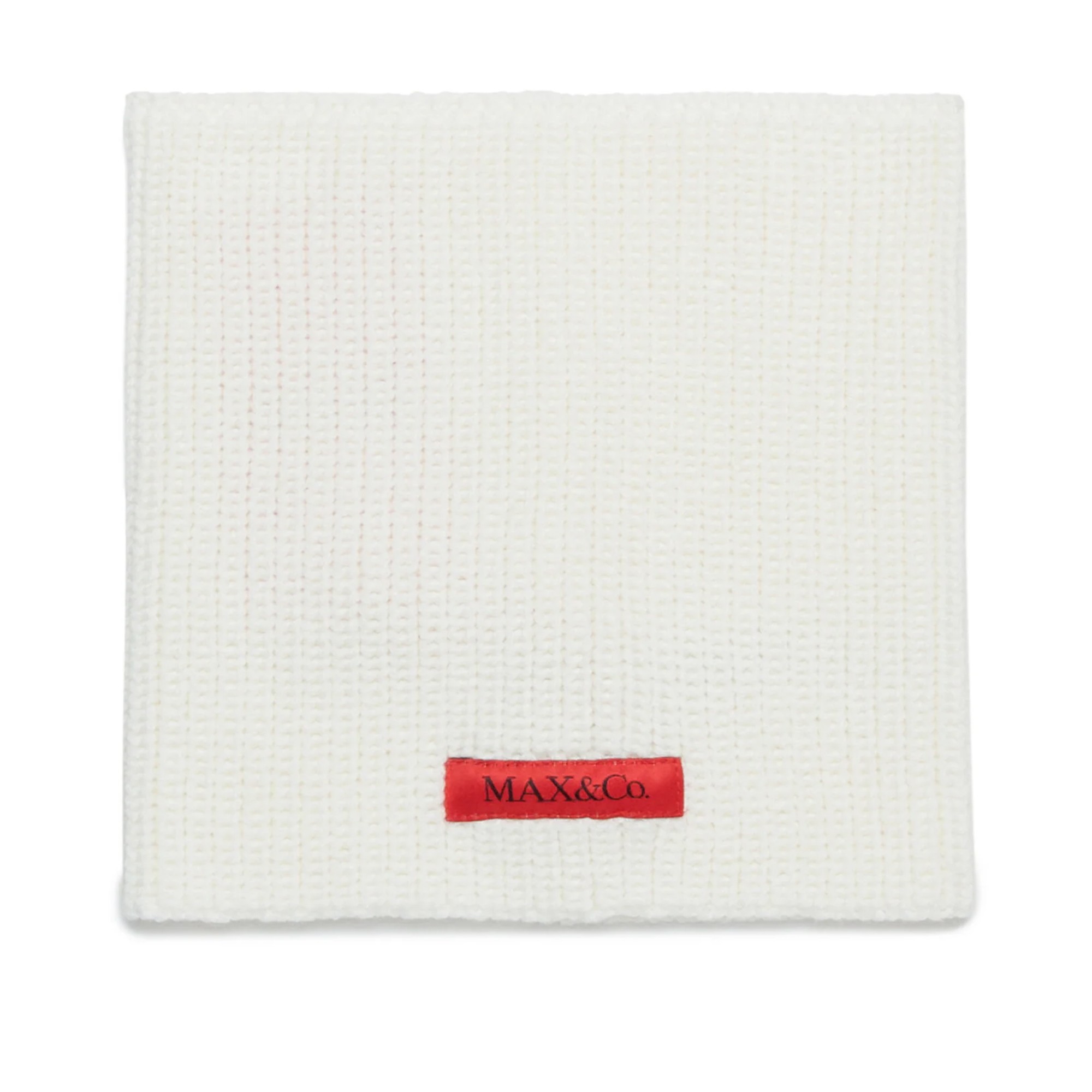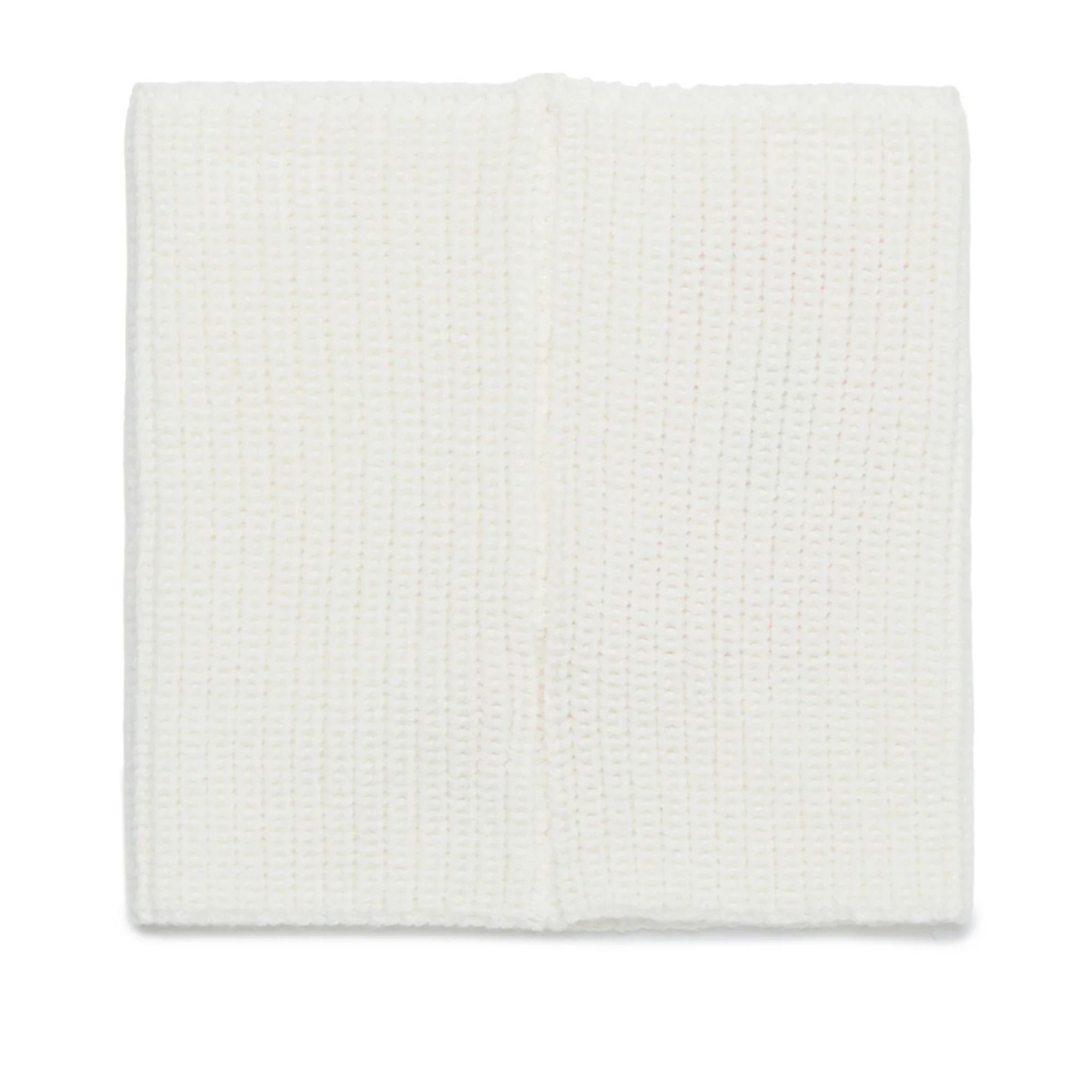 Scaldacollo bianco in maglia di misto lana con etichetta logo rossa sul davanti. Un must-have adatto a diverse occasioni.