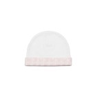 Set composto da tutina, bavetta e cappellino bianchi e rosa,