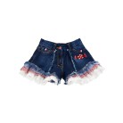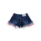 Patch caramella con strass, fondo con volant a righe e in sangallo, bordi sfrangiati e cuciture sfrangiate frontali.