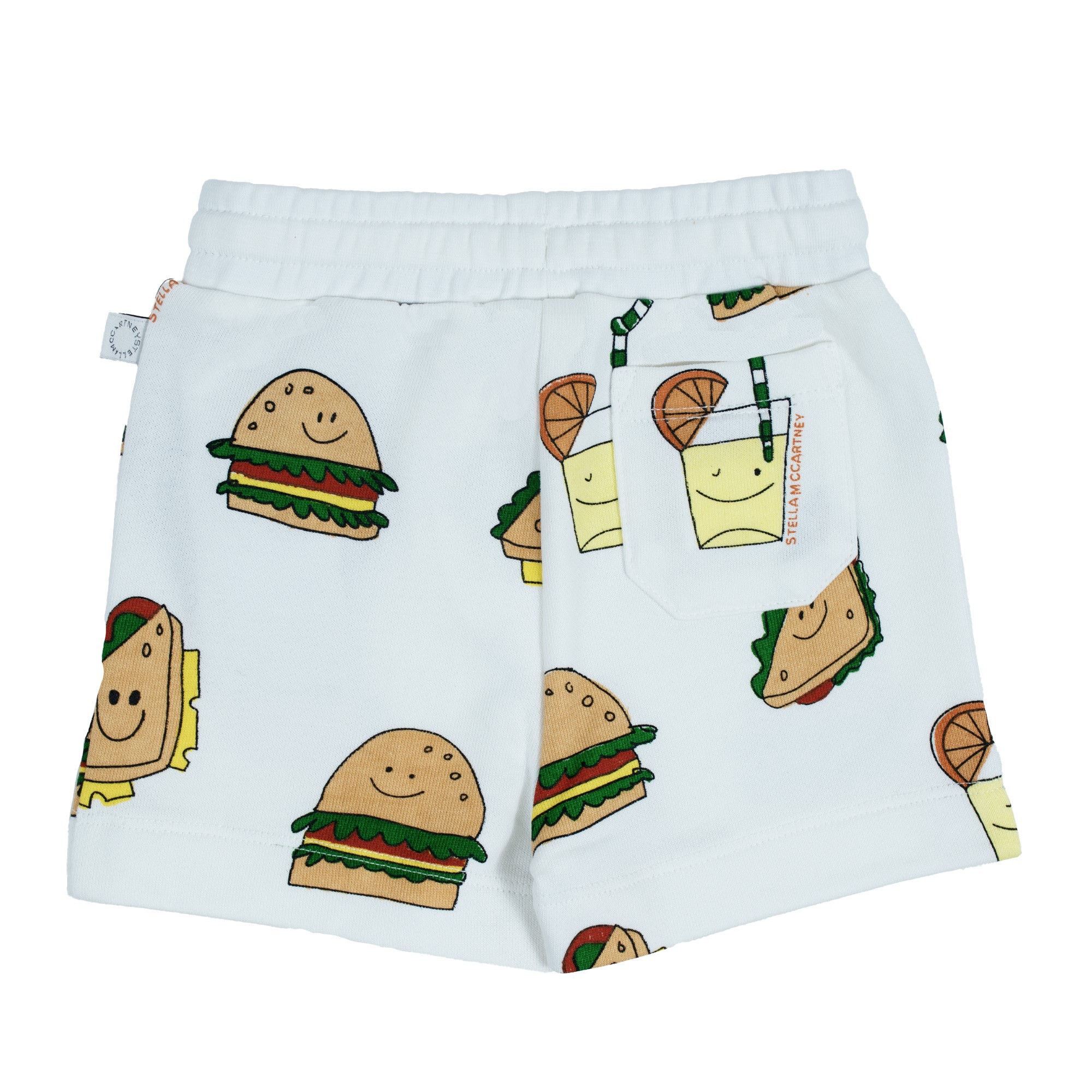 Pantaloncino corto 100% cotone per bambina e bambino di colore panna di Stella McCartney Kids in cotone organico tutto elastico in vita con laccetto modello stampa al-over decorativa ,una tasca esterna posteriore etichetta iconica laterale