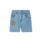 Pantalone jeans corto morbidissimo, 2 tasche avanti e due dietro, stampa di un sole ridente davanti e dietro sulle tasche apertura con bottone frontale con zip e bottone colorato tutto elastico in vita risvolto e sul fondo gamba etichetta logata posteriore sul lato destro. Fit regolare.