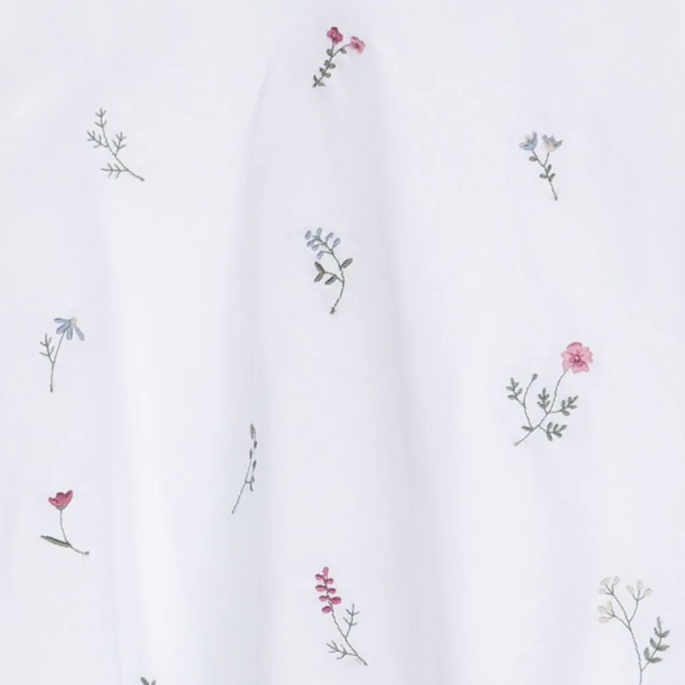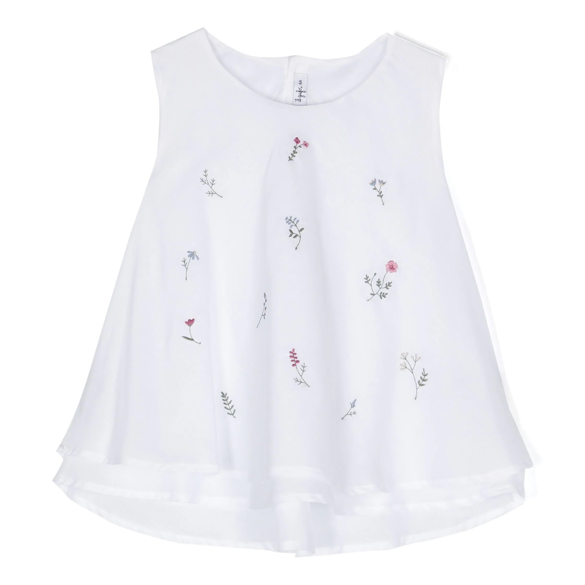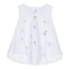 Top senza maniche dal design svasato in fresco voile 100% cotone di colore bianco composto da due strati sovrapposti: uno strato superiore arricchito sul davanti da un motivo di ricamo a fiori multicolor e lo strato inferiore leggermente più lungo e stondato sul retro. Chiusura sul retro tramite due pratici bottoncini.