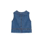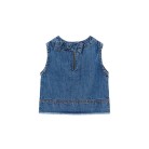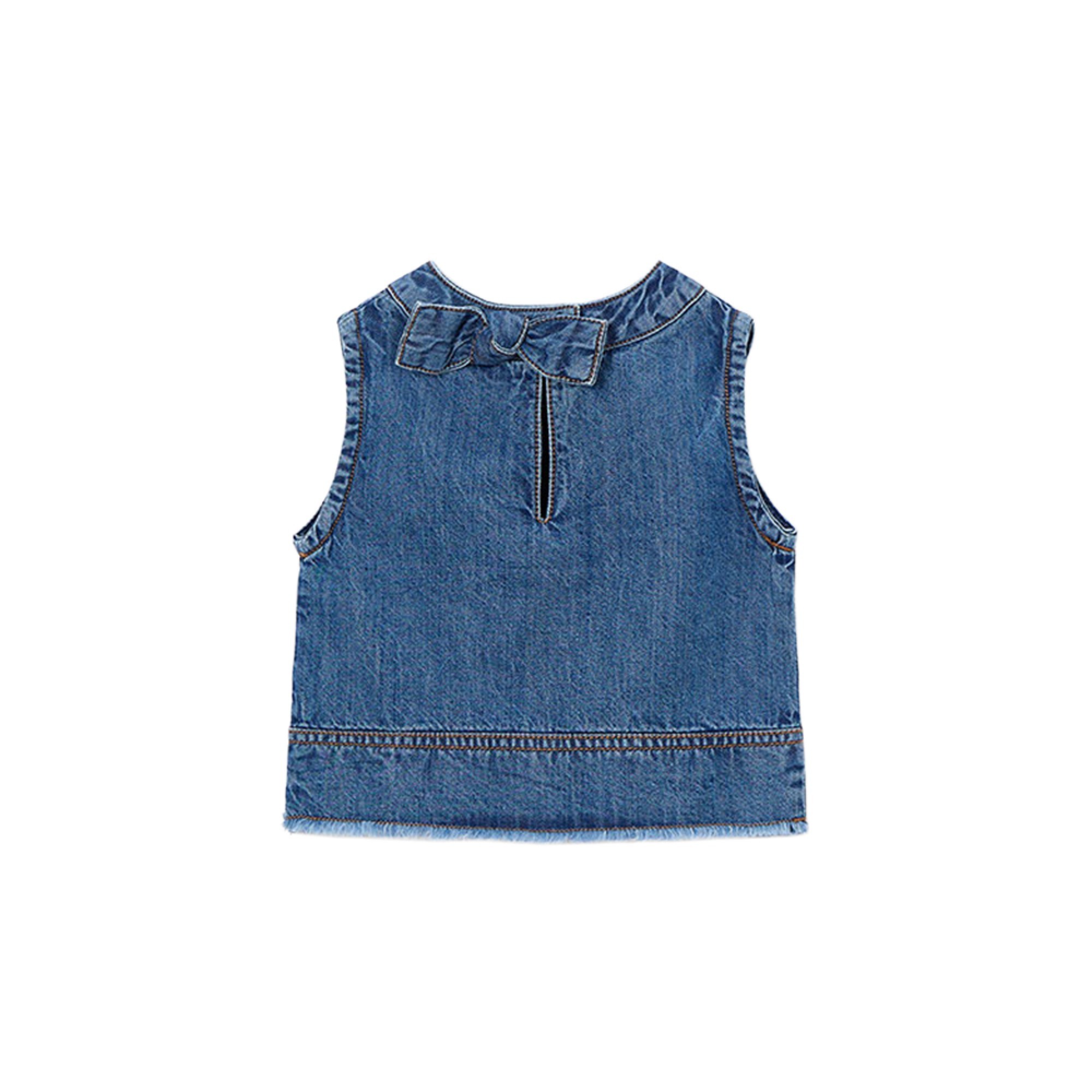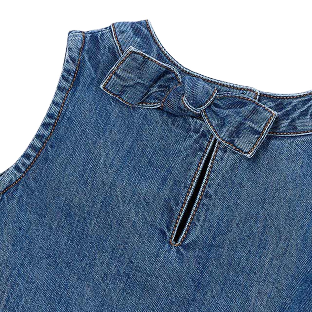 Design semplice, in denim a lavaggio medio, senza maniche, fiocco in denim sul retro, cuciture a contrasto e chiusura a goccia.