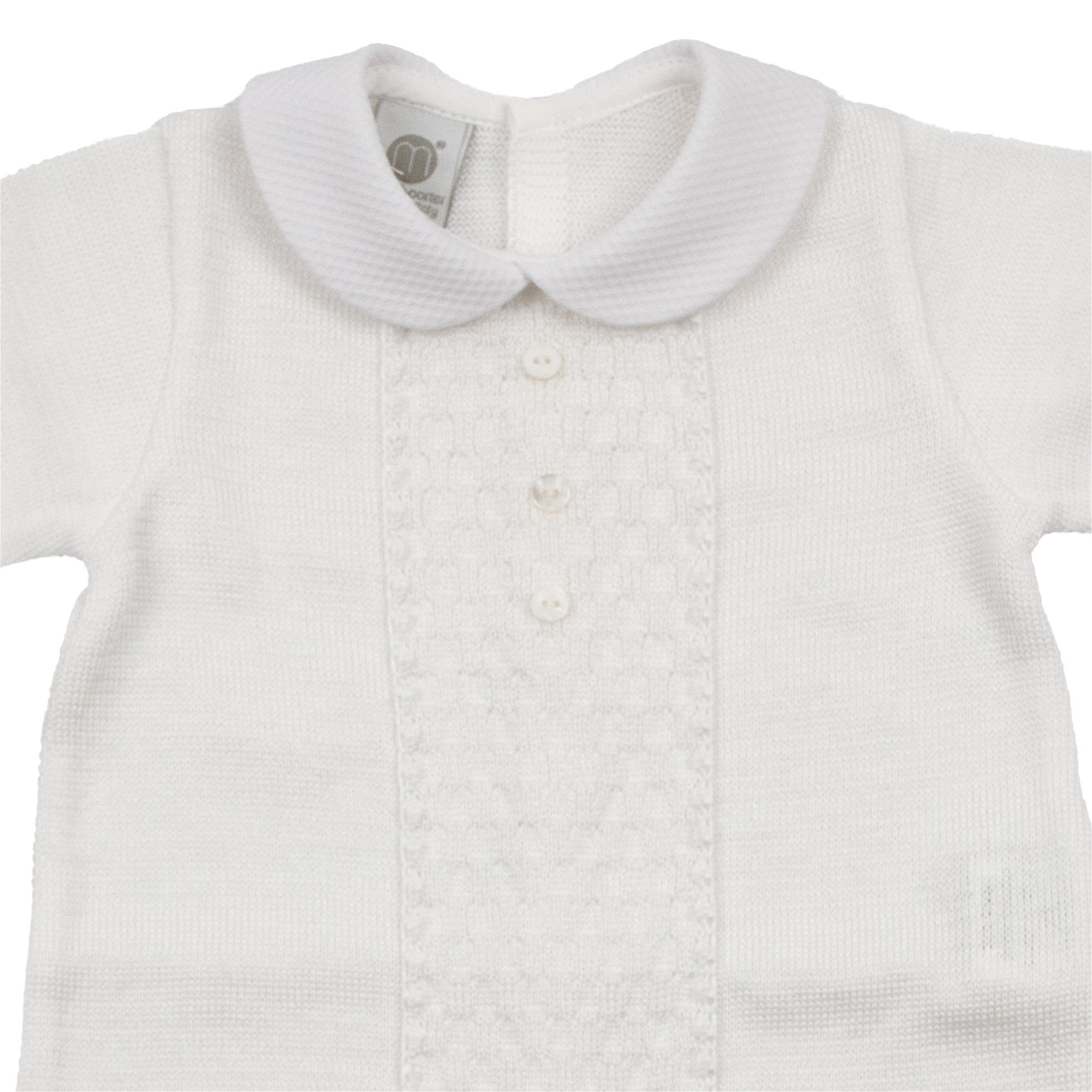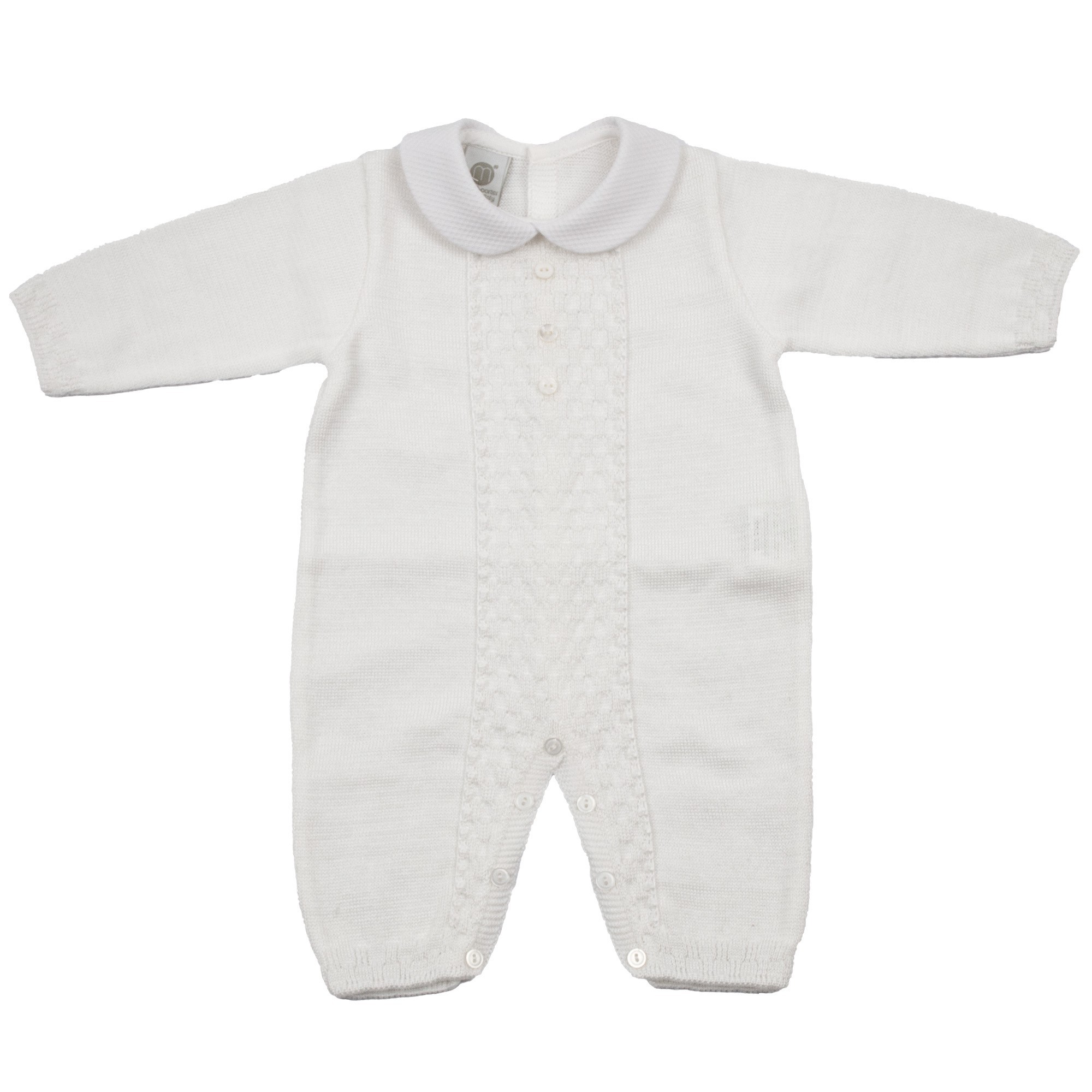 Tutina in filato di cotone bianco con manica lunga modello con colletto in tessuto tondo , apertura posteriore e inferiore tra le gambe tramite bottoncini. sul petto filato decorativo traforato