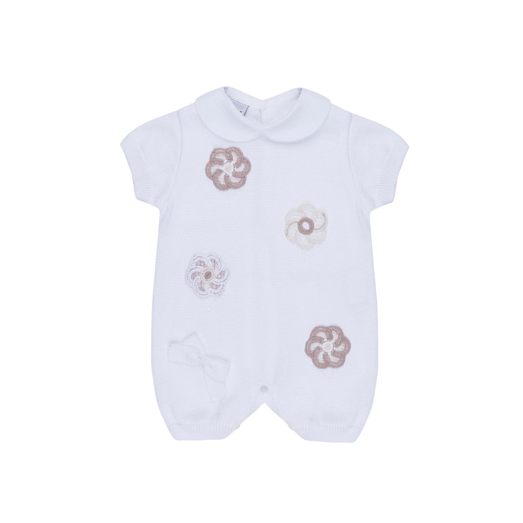 MARLU' Tutina corta bianca con ricami sabbia neonata