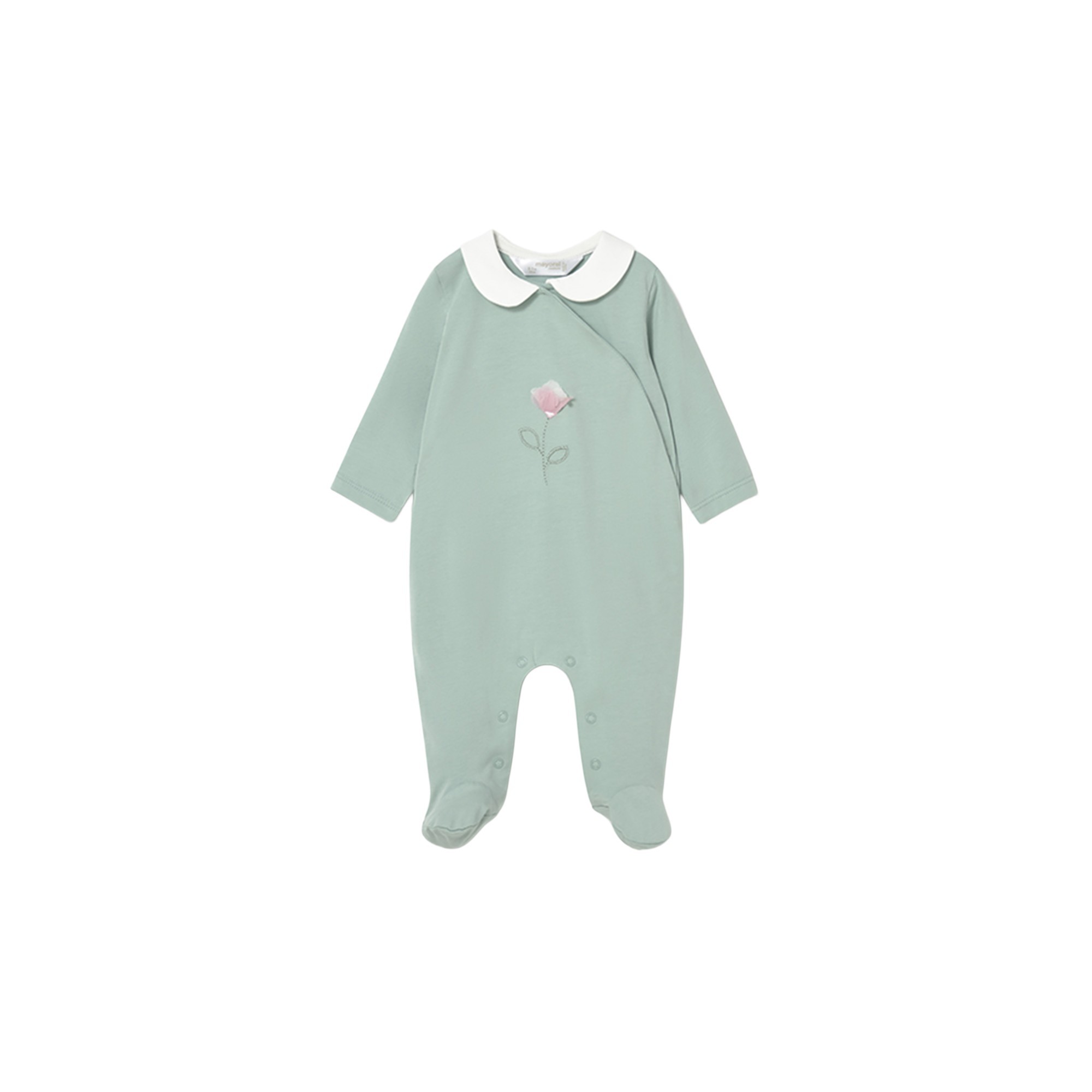 sul petto, piedini chiusi, fiorellini ricamati all-over e colletto bianco.