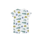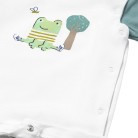 tutina bianca con rana e maniche verdi, chiusura con bottoni automatici.